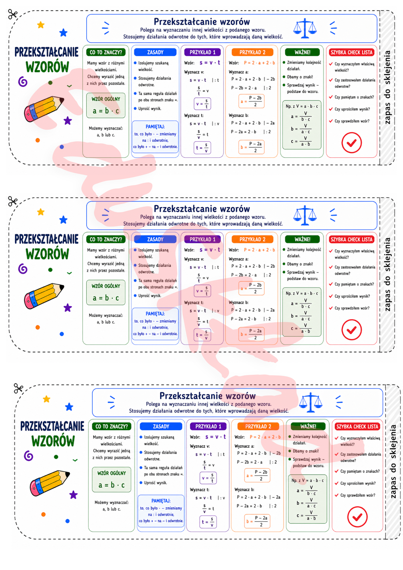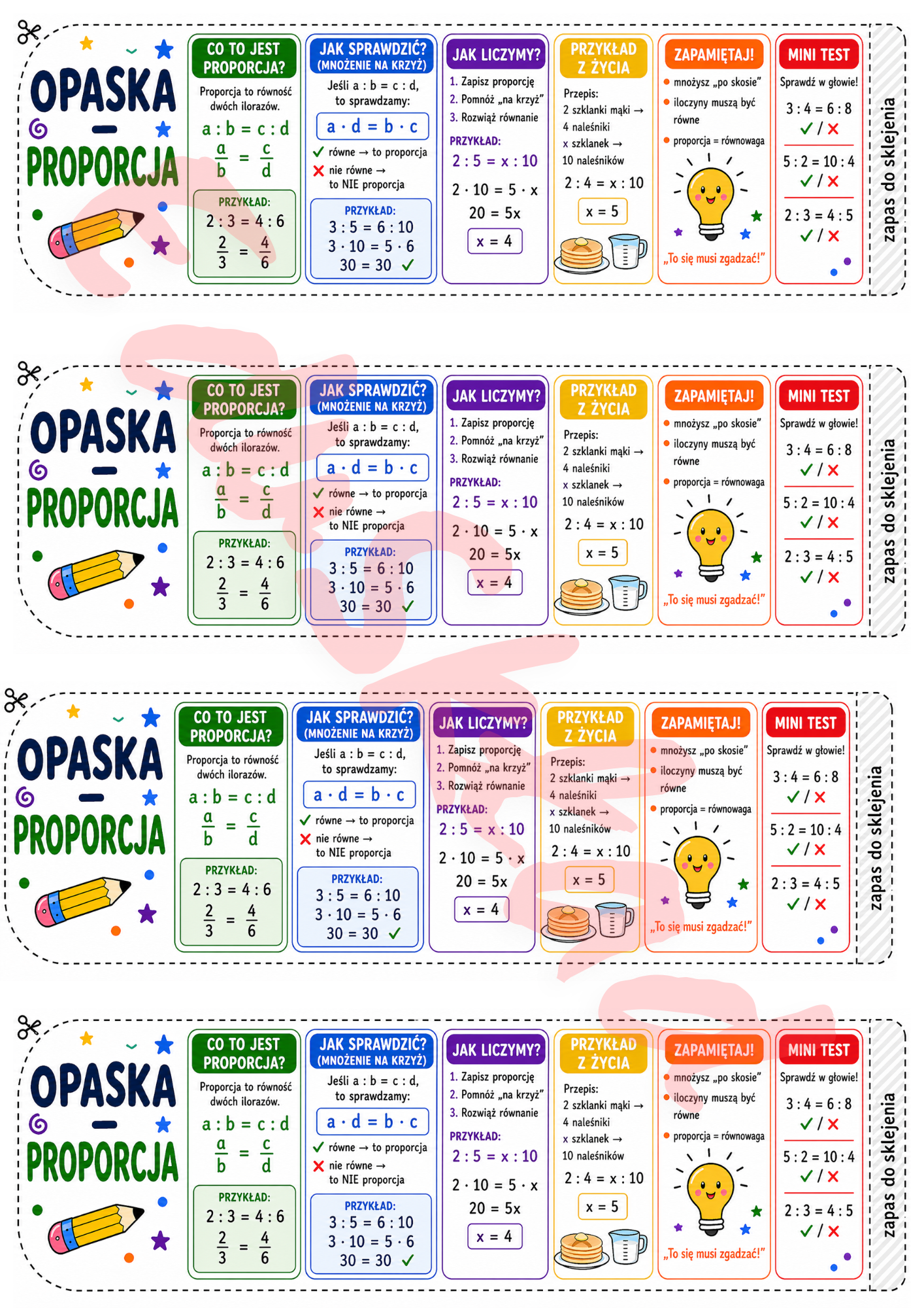 To zestaw czytelnych, kolorowych opasek matematycznych, które zawierają najważniejsze informacje z działu – w formie krótkiej „ściągi”.