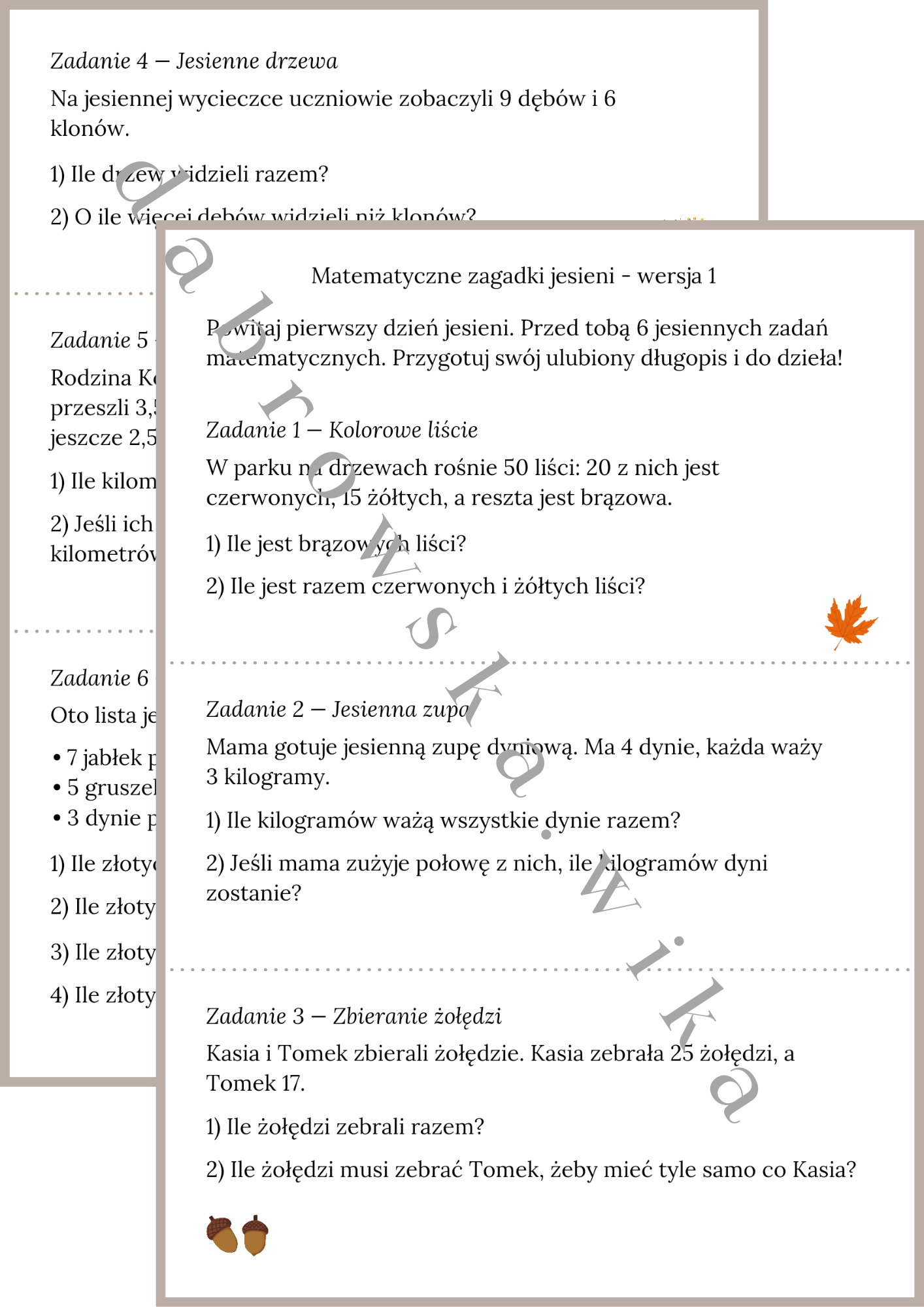 Na ucznia czeka 6 matematycznych zadań tekstowych w tematyce jesieni. Zadaniem ucznia jest wykonanie potrzebnych obliczeń i odpowiedzenie na pytania.
