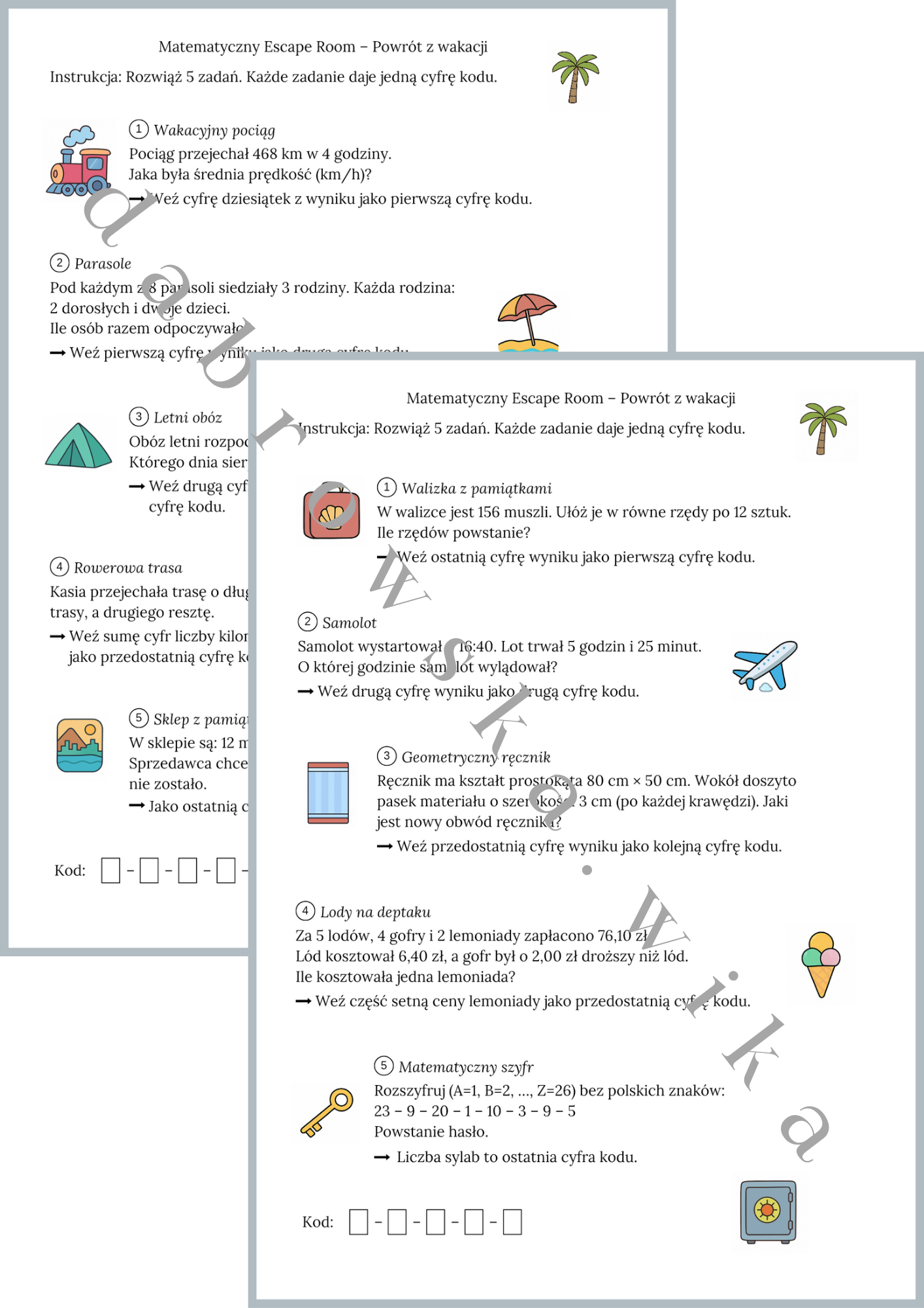 Materiał zawiera zestaw (dwie wersje) wakacyjnych zadań w formie Escape Roomu, idealnych na matematyczny rozruch po wakacjach.