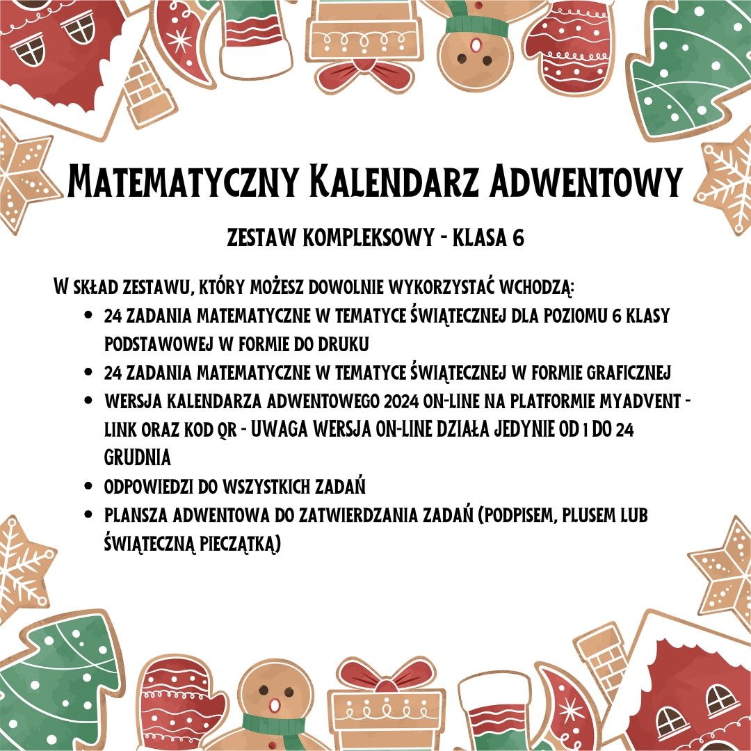 W skład zestawu MATEMATYCZNY KALENDARZ ADWENTOWY - KLASA 6, który możesz dowolnie wykorzystać wchodzą: