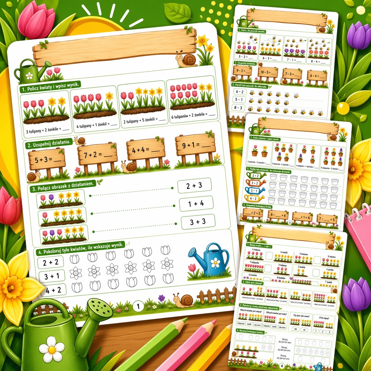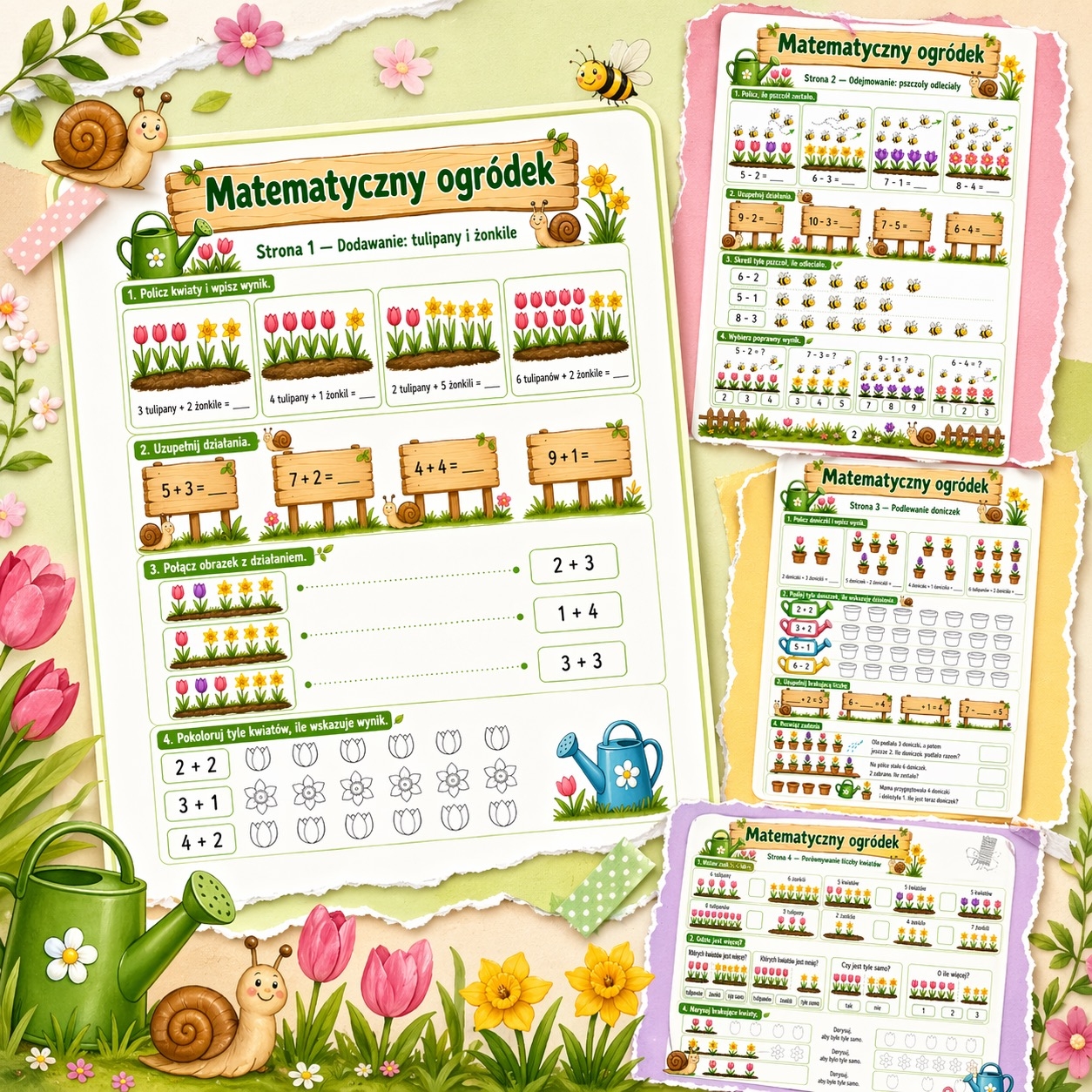 „Matematyczny ogródek” to 4-stronicowy materiał edukacyjny do ćwiczenia dodawania, odejmowania i porównywania liczb w przyjaznej, wiosennej odsłonie. 🌼