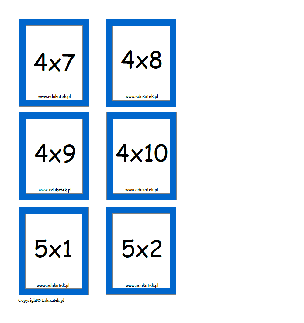 W skład zestawu wchodzi 100 kart do samodzielnego wydrukowania. Każda karta zawiera działanie dotyczące mnożenia w zakresie 100. Tak duży zestaw pozwala zorganizować zabawę dla większej ilości uczniów.