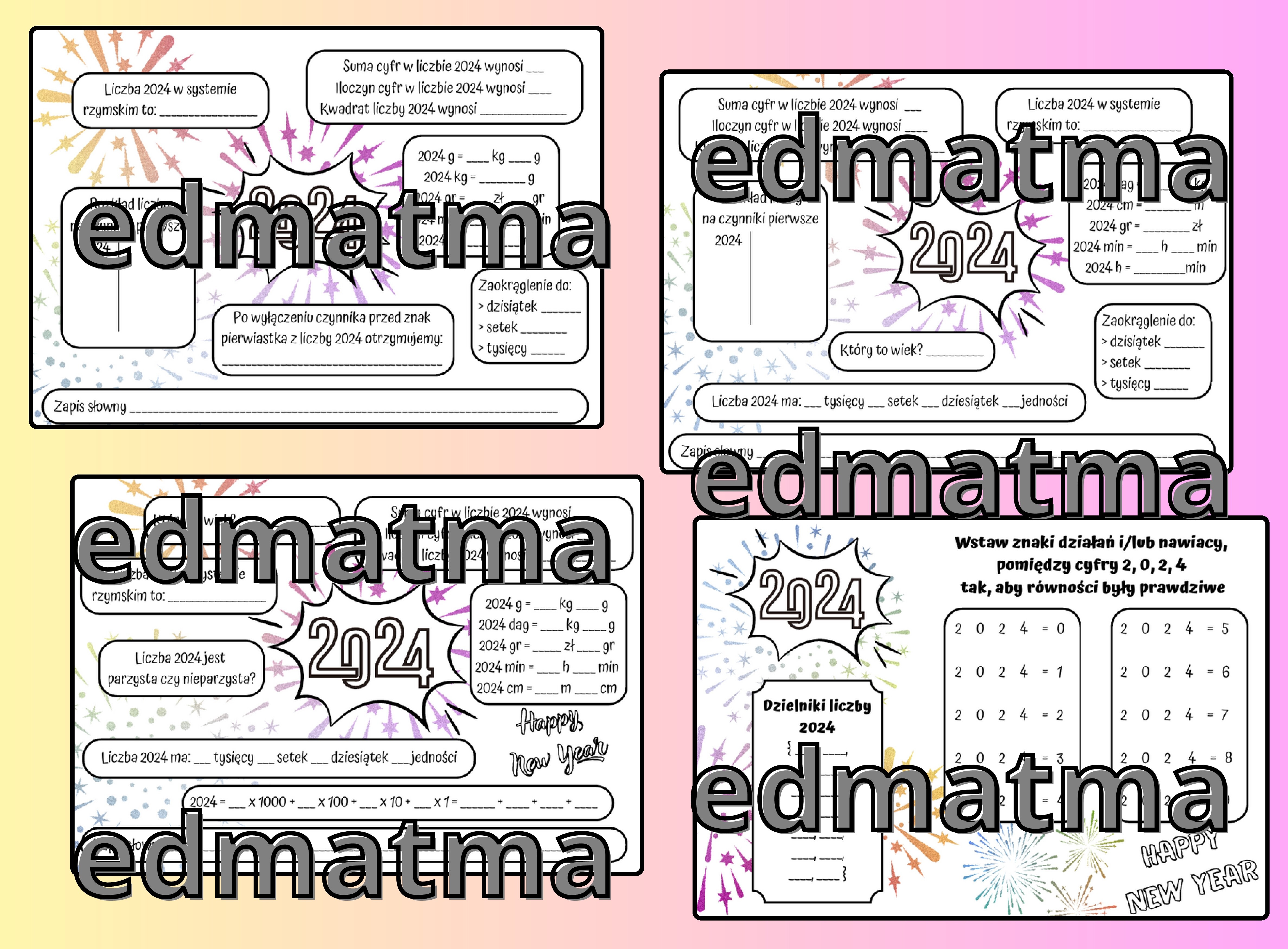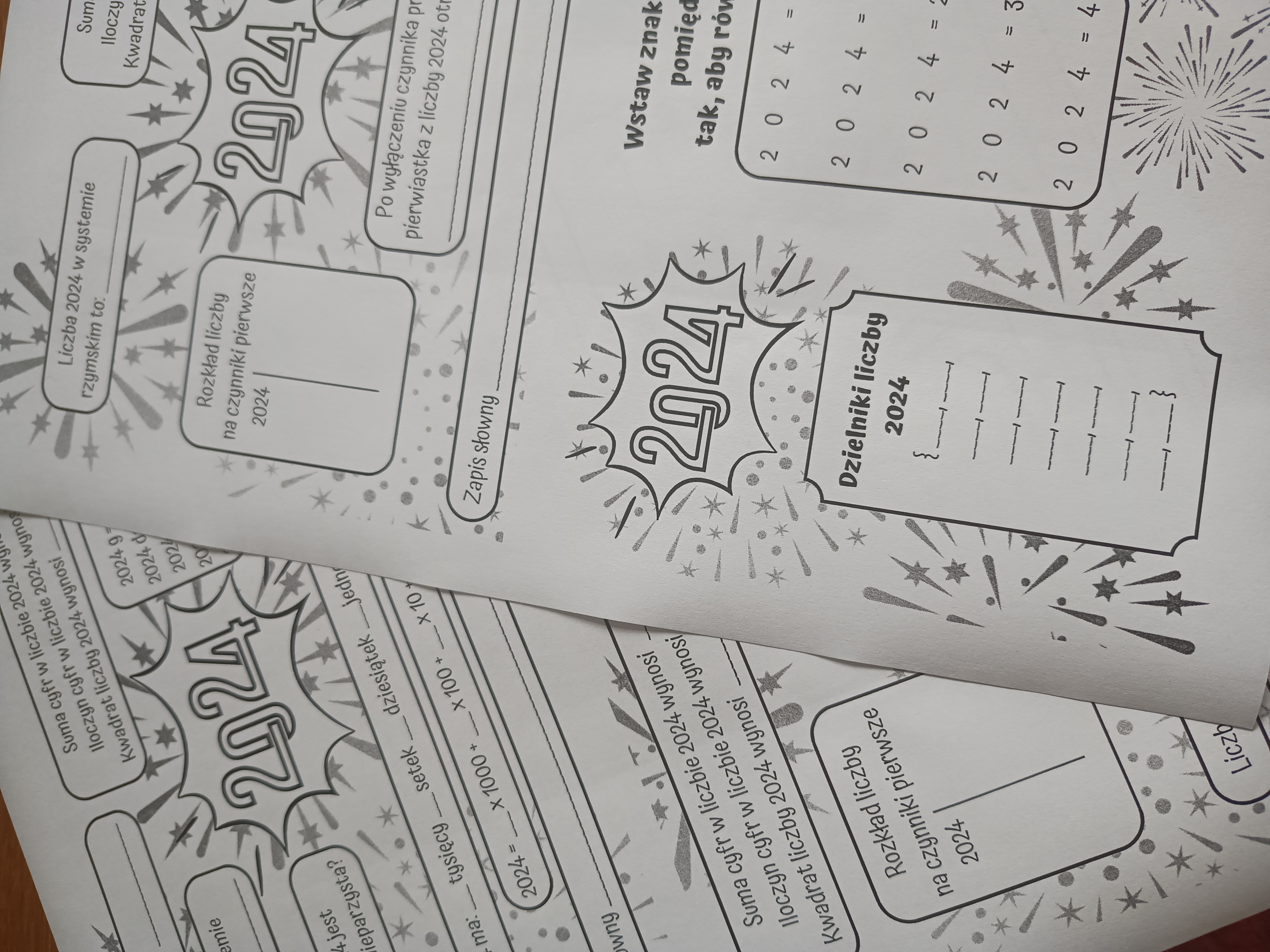 Czwarta karta pracy to zadanie polegające na wypisaniu dzielników liczby 2024 (w młodszej klasie można pominąć to zadanie) oraz zadanie polegające na uzupełnieniu znaków działań, aby otrzymać konkretny wynik, np. zadanie: 2 0 2 4 = 0 -> przykladowe rozwiązanie: 2 x 0 x 2 x 4 = 0. Zadanie to rozwija kreatywność i ćwiczy logiczne myślenie.