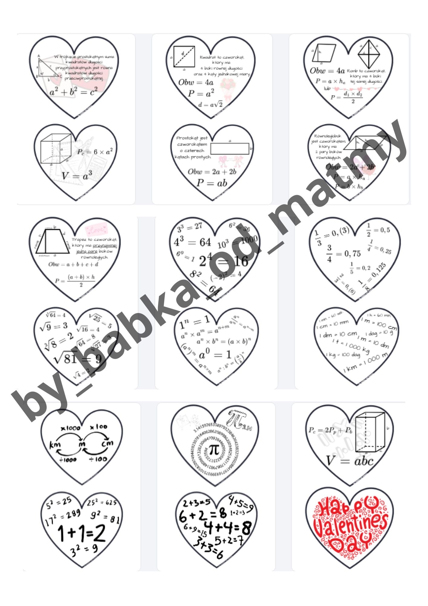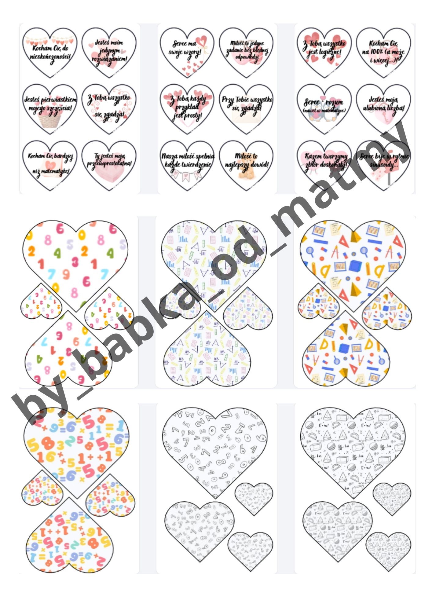 Zestaw dekoracyjny idealny na walentynkową gazetkę szkolną lub wystrój klasy matematycznej.