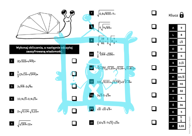 Karta pracy w postaci szyfrogramu zawierająca 15 przykładów na obliczanie wartości wyrażeń zawierających pierwiastki do wykorzystania podczas lekcji online (do przesłania uczniom lub wspólnego rozwiązywania podczas udostępniania ekranu przez nauczyciela) oraz zwykłych lekcji. Plik .pdf.