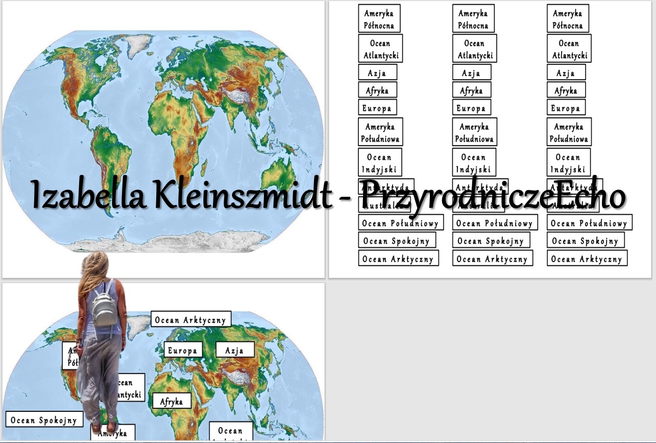 Mapa świata na kartce A4 oraz nazwy kontynentów i oceanów na drugiej kartce A4. Wszystko do zalaminowania. Można pociąć i zrobić z tego puzzle. Super sprawdza się jako praca w grupach z atlasem jako wprowadzenie do tematu.