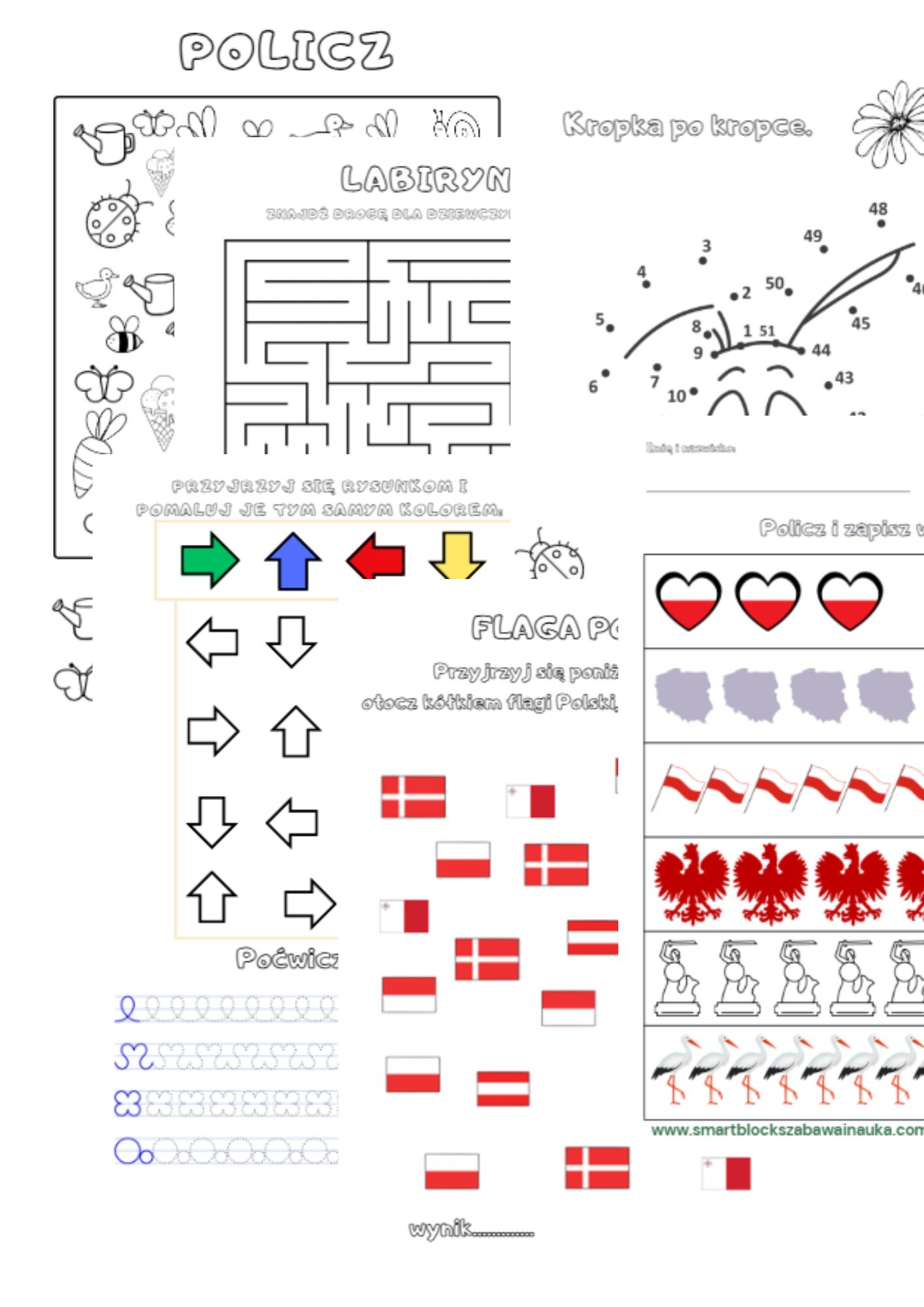 6 stron gotowych do wydruku: labirynt, poćwicz pisanie, rysuj po kropce, zadania symbole Polski.