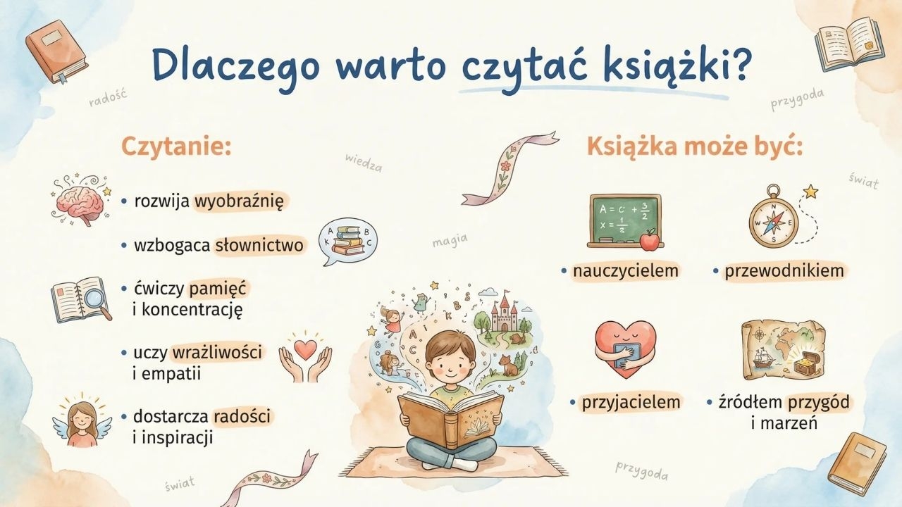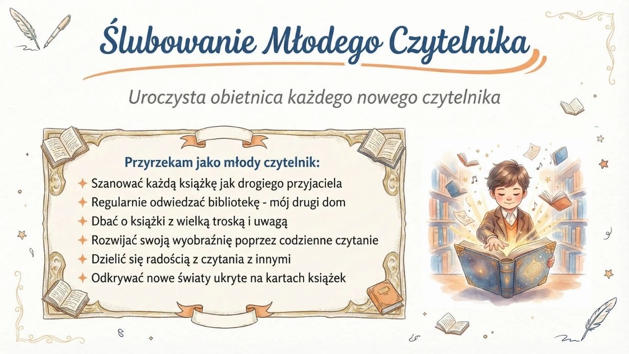 Gotowy zestaw estetycznych plansz w PDF do wykorzystania podczas uroczystości „Pasowanie na Czytelnika” oraz do dekoracji biblioteki, korytarza lub sali. Materiał zawiera stronę tytułową „Witamy w gronie Czytelników!” oraz planszę wyjaśniającą, czym jest pasowanie i dlaczego to ważne wydarzenie (str. 1–2). Znajdziesz tu także „Ślubowanie Młodego Czytelnika” z treścią uroczystej obietnicy (str. 3), planszę edukacyjną „Dlaczego warto czytać książki?” pokazującą korzyści czytania i metaforyczne role książki (str. 4), ciekawostki o książkach w formie „Czy wiesz, że…?” (str. 5), planszę „Jak dbać o nasze książki?” z zasadami korzystania z biblioteki i poszanowania książek (str. 6) oraz planszę z hasłami promującymi czytelnictwo, idealną jako fototło lub dekoracja (str. 7). Materiał jest przeznaczony dla bibliotekarzy szkolnych, wychowawców i nauczycieli edukacji wczesnoszkolnej, świetlicy oraz organizatorów uroczystości czytelniczych, szczególnie dla uczniów klas 1–3. Zestaw ma formę 1 pliku PDF i zawiera 7 stron/7 plansz. Rozwija i wzmacnia motywację do czytania, buduje kulturę czytelniczą, poszerza świadomość korzyści płynących z lektury, uczy zasad dbania o książki i odpowiedzialności za wspólne zasoby, a także wspiera komunikację i umiejętność składania uroczystej obietnicy podczas wydarzeń szkolnych. Aby pracować z materiałem, wystarczy wydrukować plansze w A4 lub A3 i wywiesić je jako dekorację na czas pasowania; możesz też poprowadzić krótką rozmowę z uczniami na podstawie planszy „Dlaczego warto czytać…?”, wspólnie przeczytać ciekawostki, a ślubowanie wykorzystać jako centralny punkt uroczystości (odczyt przez bibliotekarza, powtarzanie przez uczniów, pamiątkowe zdjęcie na tle plansz).