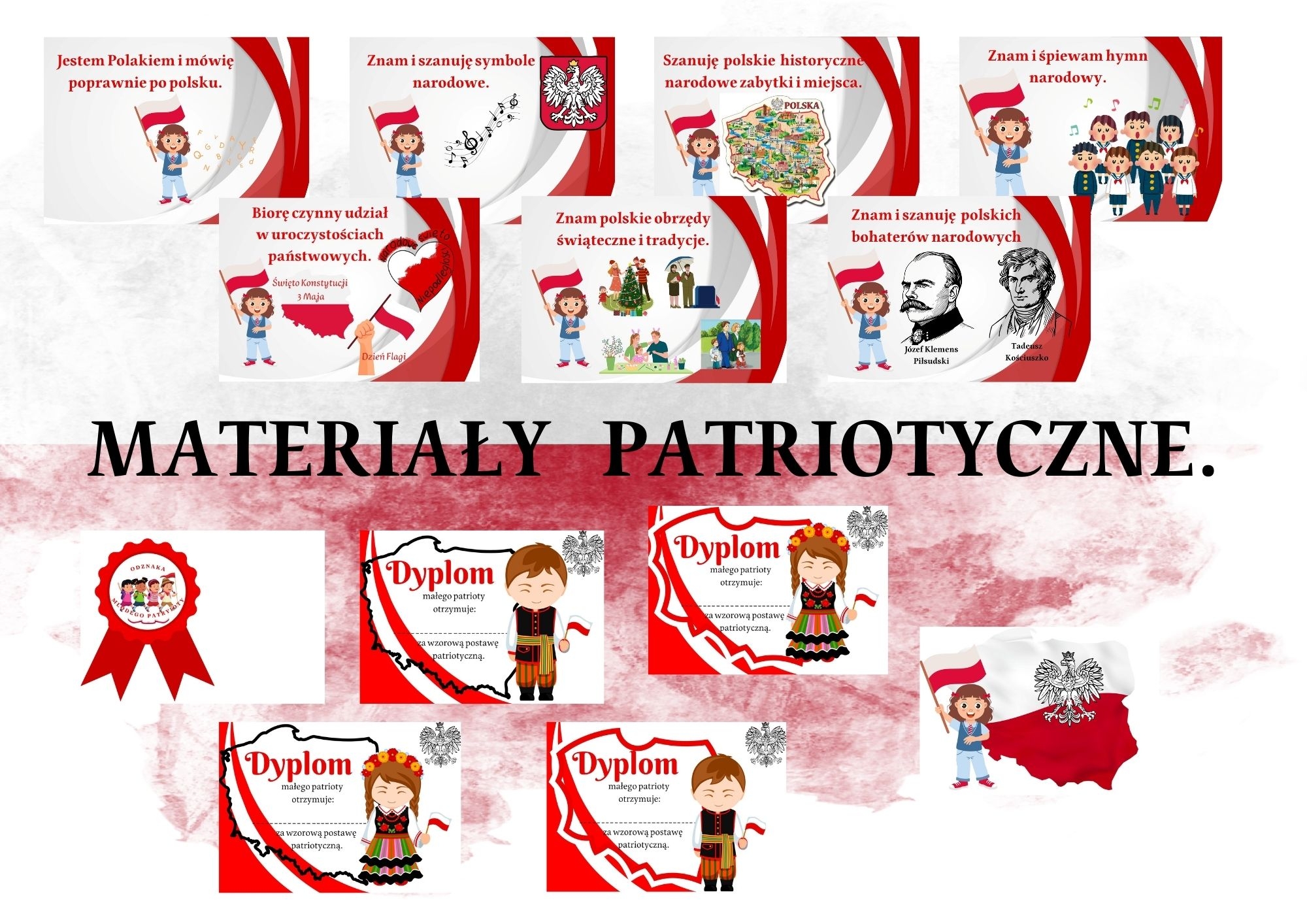 Plik zawiera zbiór materiałów patriotycznych. W pliku najdziemy zestaw gotowych kar "Kodeks małego patrioty", który można wykorzystać podczas zajęć lub dekorację sali jak i również" Dyplomy małego patrioty" w dwóch wersjach oraz "Oznakę małego patrioty".