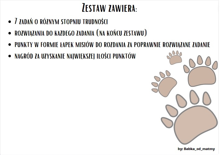 Zestaw zadań oparty jest na podstawie programowej dostosowanej do klasy 4. Zawiera zadania związane z obliczeniami pamięciowymi: - dodawanie - odejmowanie - mnożenie - dzielenie - potęgowanie - kolejność wykonywania działań - dzielenie z resztą - krótkie zadania tekstowe Zadania można wykorzystać zarówno na lekcji powtórzeniowej działania pamięciowe, jak również na kółku matematycznym w klasie 4. W skład materiału wchodzi: - 7 zadań o różnym stopniu trudności - rozwiązania każdego zadania (na końcu zestawu) - zbiór punktów, które można przydzielać uczniom za poprawne rozwiązania zadań - nagrody w postaci kuponów (uzupełnione, jak również puste - do samodzielnego uzupełnienia przez nauczyciela) Zapraszam do zakupu :)