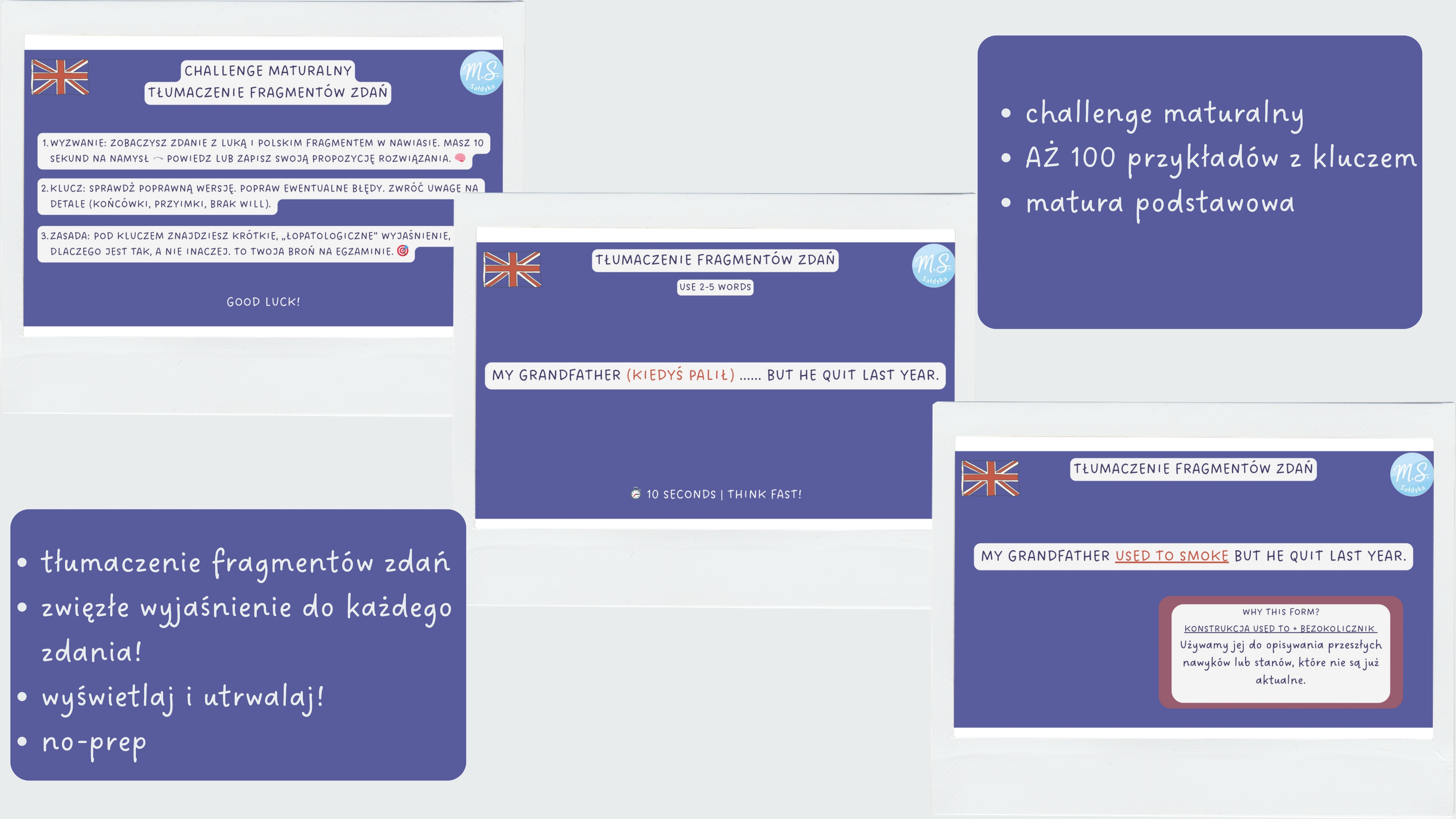 Ten zestaw to 100 interaktywnych wyzwań w formacie „Problem-Klucz”, które realnie przygotowują do sekcji Tłumaczenie fragmentów zdań na maturze podstawowej. Moi uczniowie bardzo lubią taką formę powtórek i nauki, więc wychodzę z taką samą propozycją do Was :)