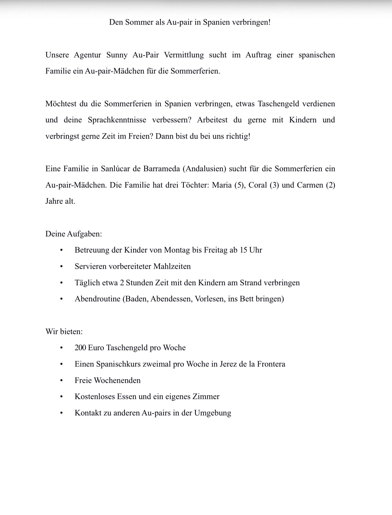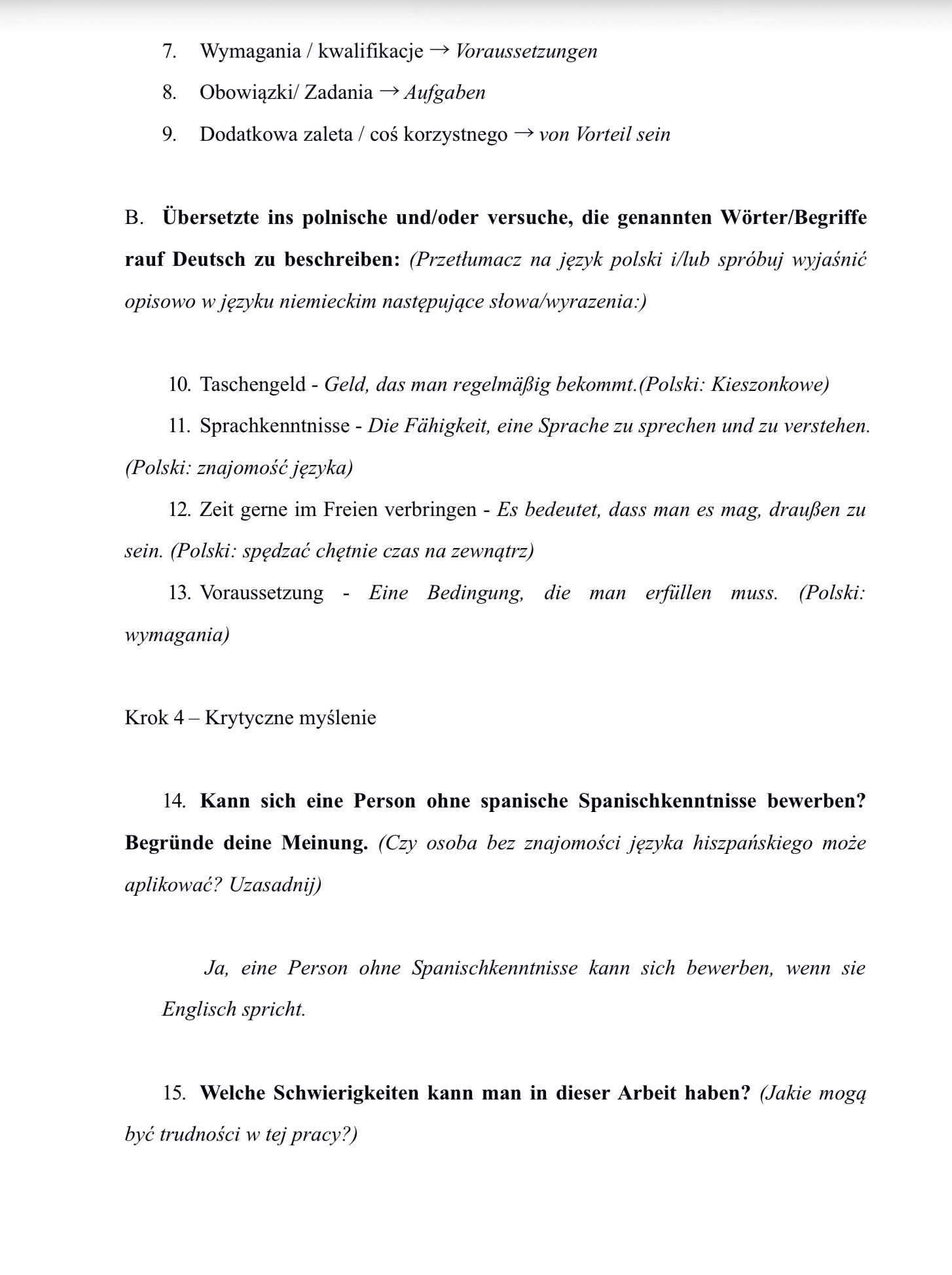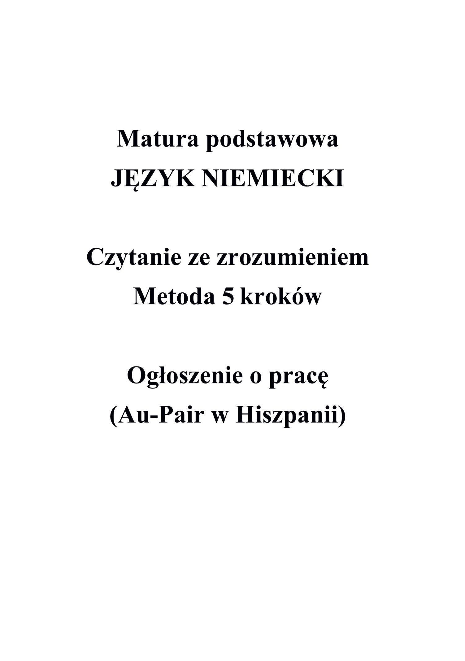 Materiał został opracowany na podstawie autorskiego tekstu w formie ogłoszenia o pracy (Au-Pair w Hiszpanii) i przygotowany według Metody 5 kroków, która uczy ucznia systematycznej analizy tekstu egzaminacyjnego.