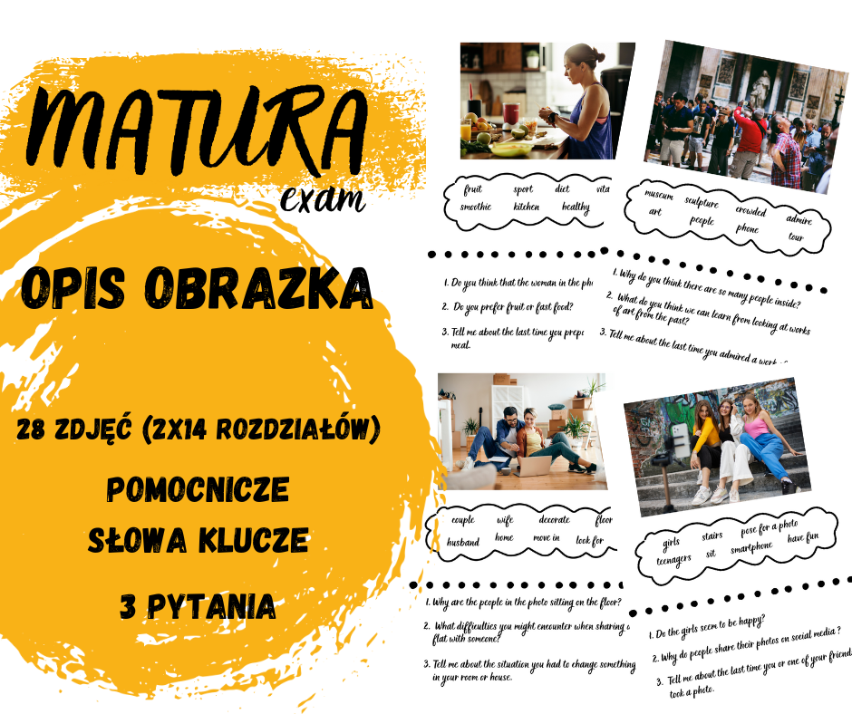 MATURA EXAM 📣‼️ OPIS OBRAZKA Plik zawiera 28 obrazków (po 2 do każdego rozdziału). Pod każdym obrazkiem znajduje się chmurka z wyrazami kluczami, które mają na celu naprowadzenie ucznia na dobór odpowiednich słów i zwrotów związanych z sytuacją na obrazku 😊 Szczególnie przyda się słabszym uczniom. Pod obrazkiem znajdują się 3 pytania. Poćwicz ze swoimi maturzystami już dziś 🤓 Plik PDF  #matura #maturaexam #opisobrazka