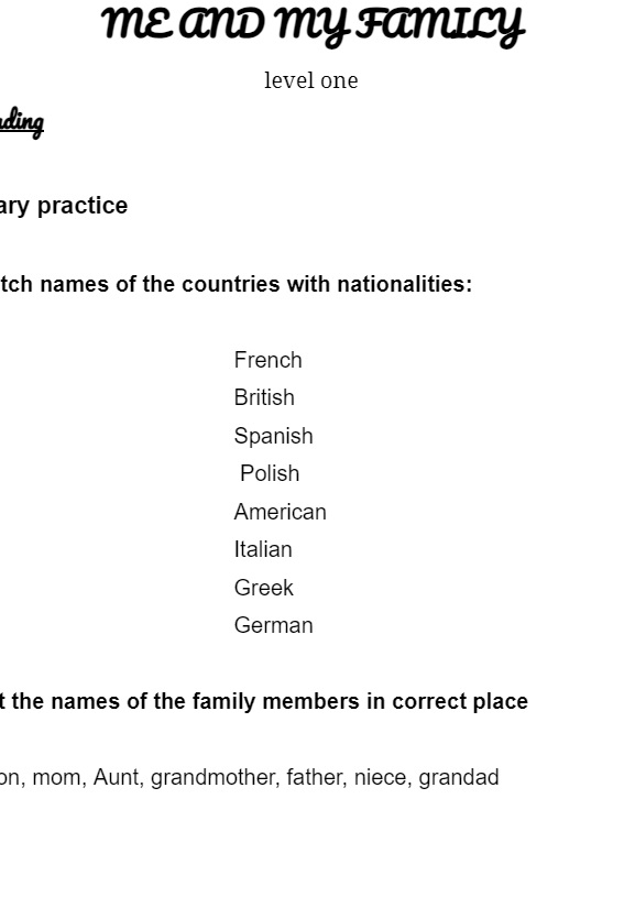 Vocabulary and reading exercises for A1 learners. Use if you want to pratice: countries, nationalities, family members, present simple, appearance.