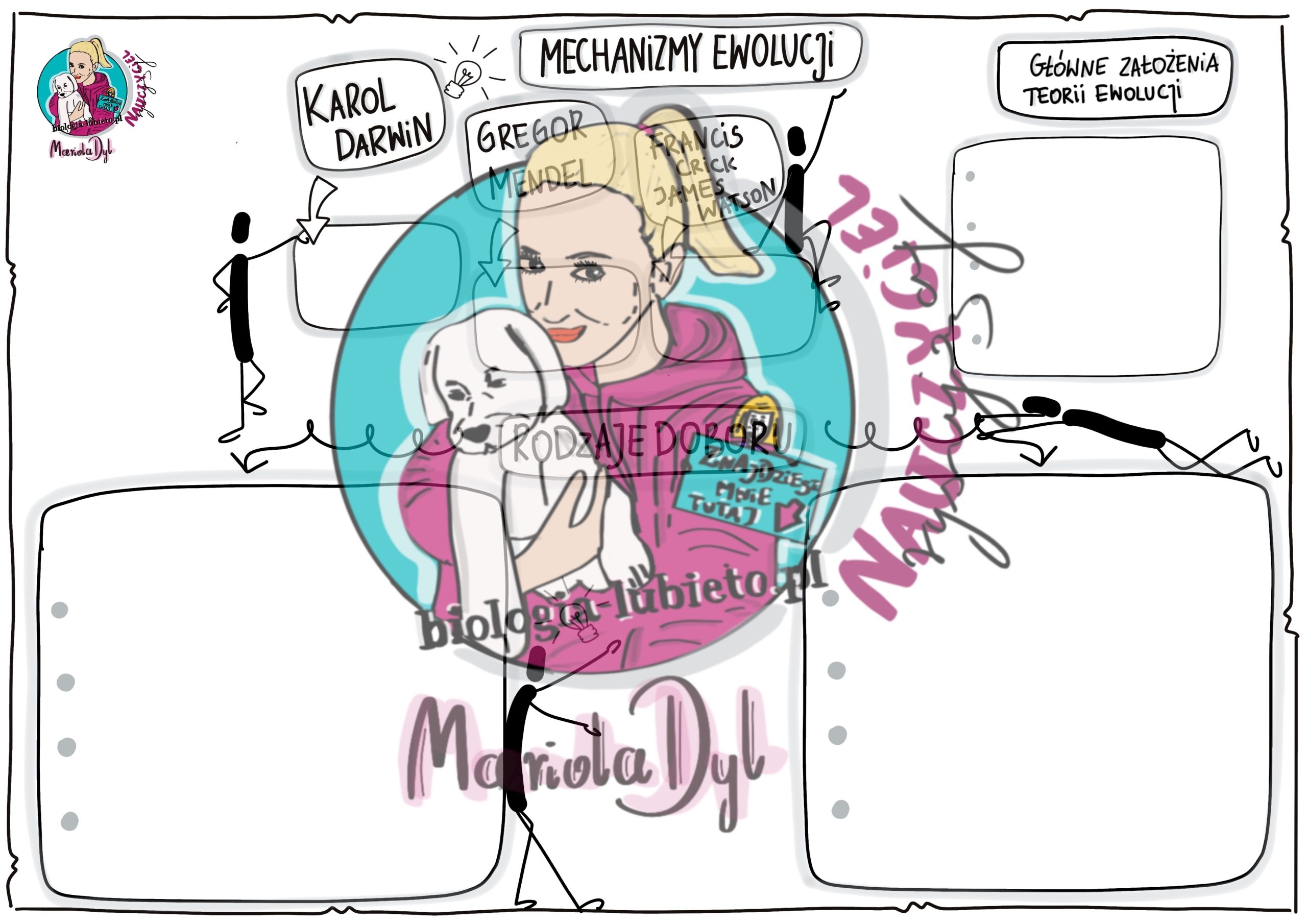 Hej, nazywam się Mariola Dyl, jestem nauczycielką biologii i przyrody w szkole podstawowej. Uwielbiam pracę z dziećmi i młodzieżą, marzę o szkole bez ocen, rywalizacji i wszechobecnej papierologii. W swojej pracy kieruję się zasadą "Bądź takim nauczycielem, jakiego chciałbyś dla swojego dziecka". Lubię angażować uczniów w myślenie, pobudzać ich kreatywność, dawać tak zwane „pole do popisu” ich wyobraźni i spontaniczności. Materiał, który przygotowuję tworzę przede wszystkim z myślą o uczniach. To dla nich przyswajanie wiedzy ma być przyjemnością. Obserwując niechęć uczniów do notowania w sposób tradycyjny, zauważyłam, że te same treści w innej formie są o wiele łatwiejsze do zapamiętania. Im więcej słów chcemy przekazać, tym nasza notatka staje się dłuższa i trudniejsza do zapamiętania. Zastąpienie ich rysunkami, symbolami, grafiką pozwala na wzmocnienie procesu myślenia u ucznia. Ułatwia notowanie, zapamiętywanie, a jednocześnie pobudza mózg do myślenia. Jeśli jeszcze uczeń – szczególnie ten młodszy, może dodatkowo „współtworzyć” notatkę – poprzez wypełnianie karty pracy, jej kolorowanie, kreowanie całości – zapomina, że właśnie się uczy. I to jest efekt, do którego dążę. Swoją pasją chcę też dzielić się z innymi wspaniałymi nauczycielami, których każdego dnia odkrywam w mediach społecznościowych. Czerpię z ich kreatywności, dają mi ogromną moc i chęć pogłębiania wiedzy i rozwoju osobistego. To także ukłon w stronę rodziców, którzy w natłoku codzienności pragną wspierać swoje dzieci w ich codziennych zmaganiach szkolnych. Prowadzę swój Fanpage na Facebooku i Instagramie "Biologia -Lubię to". Oprócz rysowania mam wiele innych pasji takich jak: pisanie, szkicowanie, malowanie, ogród, bieganie, joga i podróże. Zaglądajcie też na moja stronę https://biologia-lubieto.pl/ Zapraszam Mariola