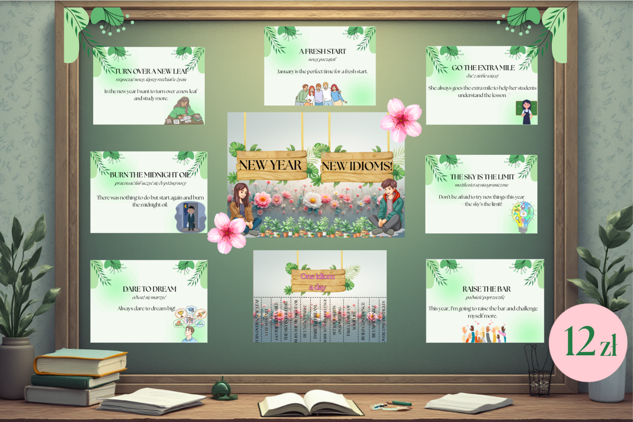 🌿 NEW YEAR – NEW IDIOMS! 🌿 Estetyczna i funkcjonalna gazetka ścienna po angielsku, łącząca dekorację z aktywną nauką. Wiele możliwości aranżacji gazetki! Zestaw zawiera: 🖼 Plakat główny XXL – 4 × A4 jako centralny element tablicy. 📚 13 plansz z idiomami i kolokacjami (wyjaśnienia + przykłady). 📝 Ćwiczenia dla uczniów: Use the idiom in a sentence – uzupełnianie zdań Match & Choose – dopasowywanie i wybór poprawnej odpowiedzi ✂ Zrywka z idiomami – idealna do codziennej pracy na lekcji. ✔ Klucz odpowiedzi w zestawie – oszczędność czasu dla nauczyciela. 📄 Łącznie aż 30 stron PDF, gotowe do druku i wywieszenia. 🌸 Spójna, nowoczesna grafika z motywem nowego początku. 🎯 Klasy 5–8 i szkoła średnia 💰 Cena: 12 zł