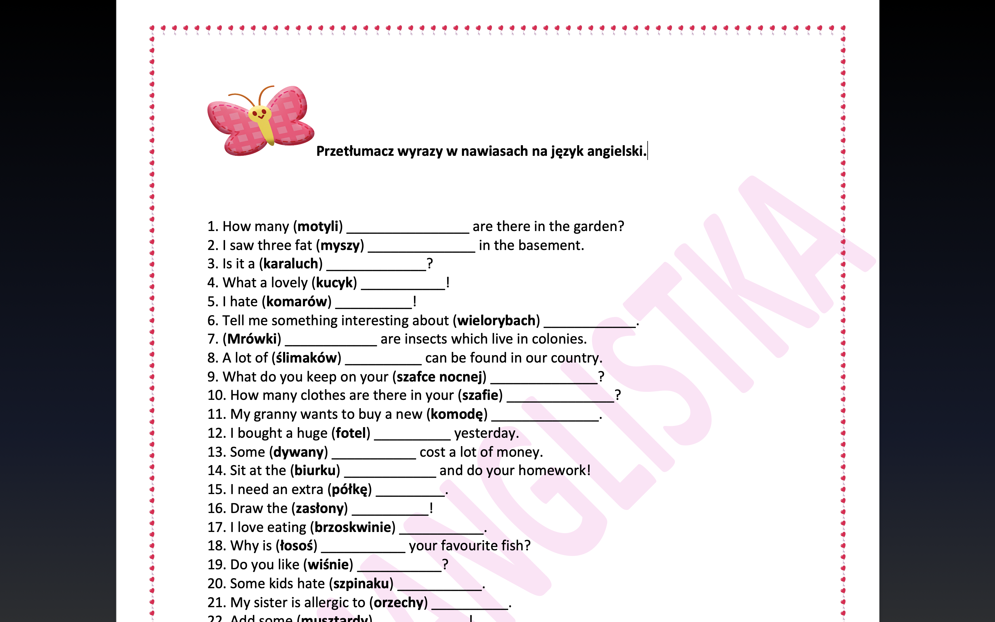 Mega powtórka ze słownictwa- aż 60 zdań do uzupełnienia z kluczem- EGZAMIN ÓSMOKLASISTY/ MATURA Materiał składa się z 60 zdań. Zadaniem ucznia jest przetłumaczenie słówek w nawiasach na j. angielski. Na końcu znajduje się klucz.