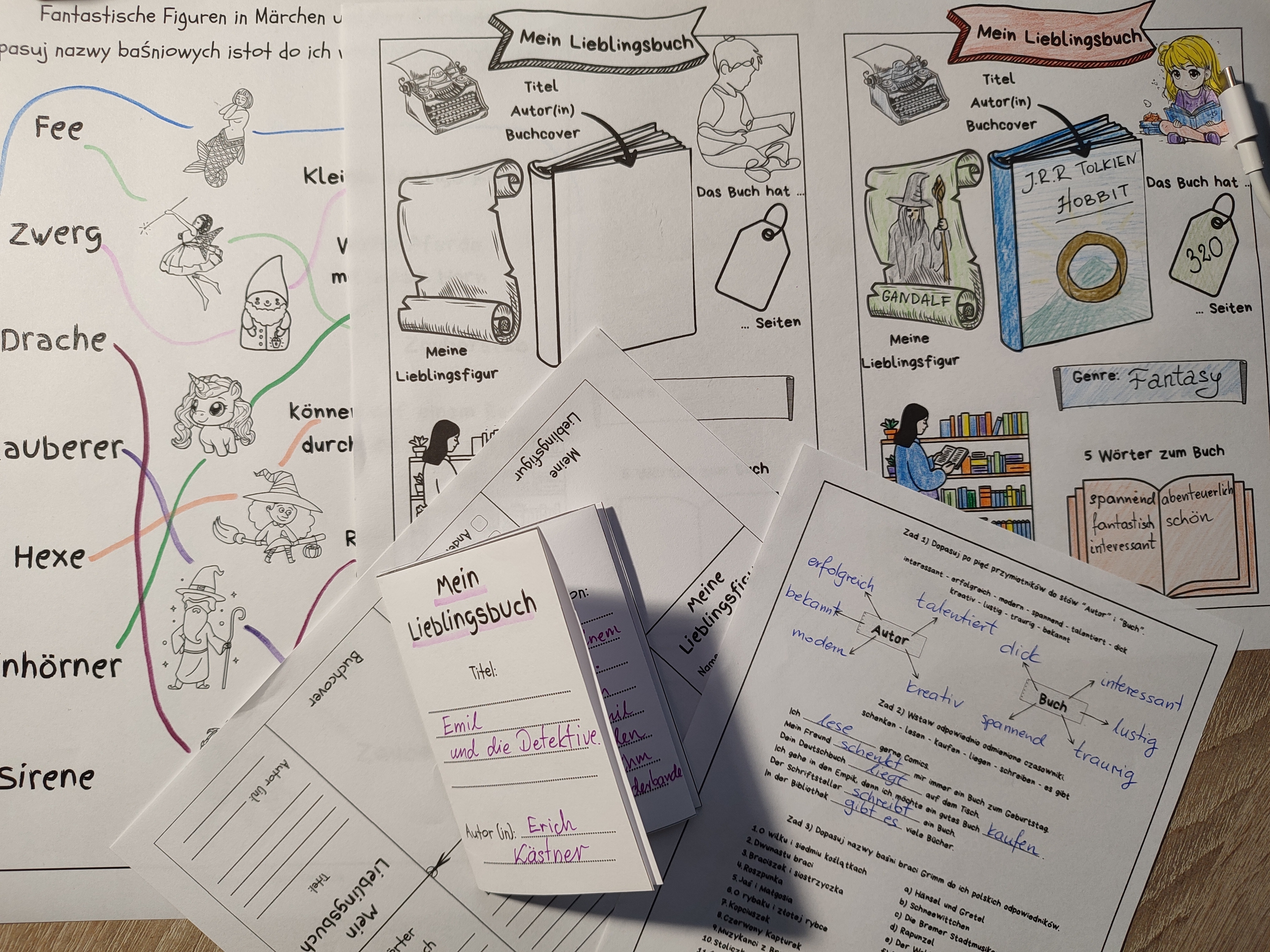 4 - Minibuch „Mein Lieblingsbuch” - miniksiążeczka do zrobienia przez dzieci, instrukcja jak ją złożyć jest w internecie, wystarczy wpisać „Minibuch falten”, filmik dostępny również na instagramie EnglishGermanInOneBox.