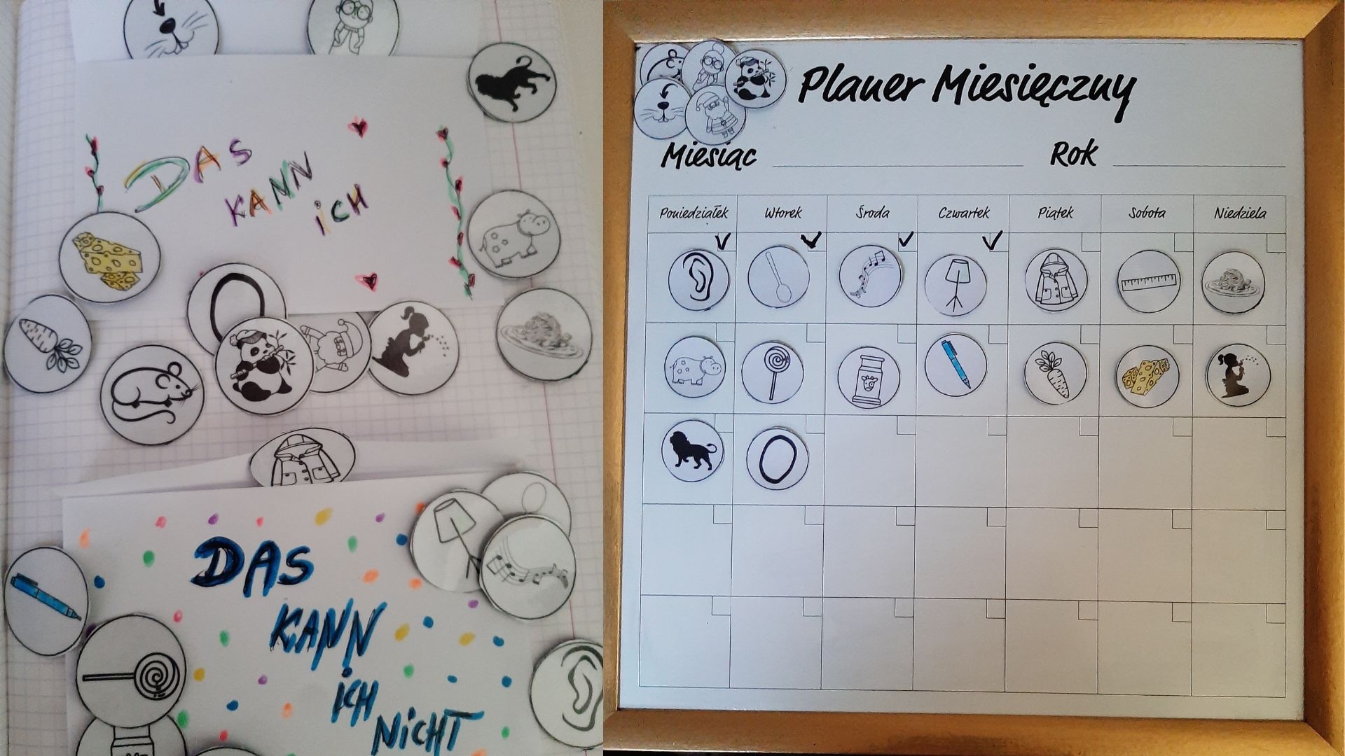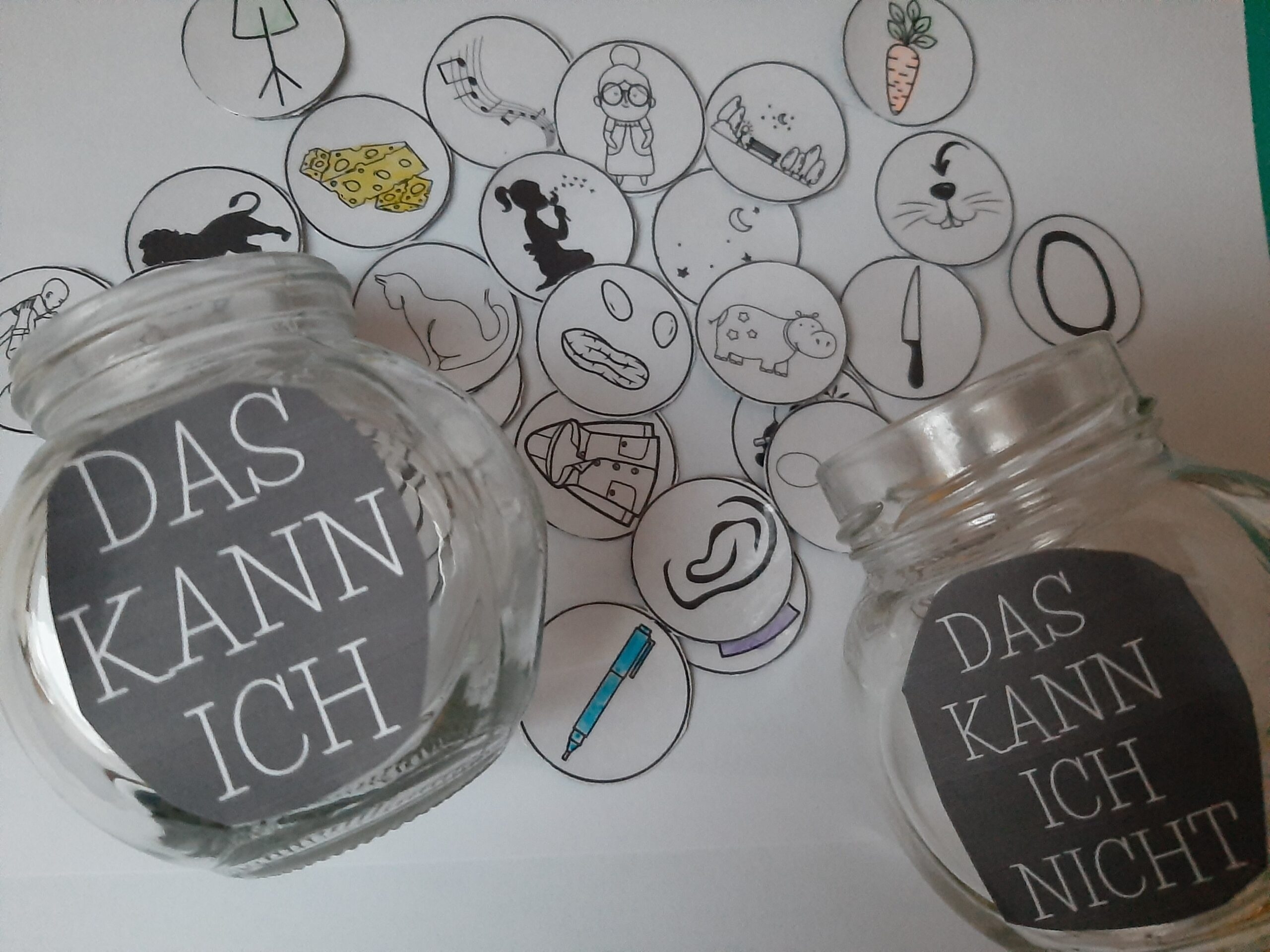 Słoik słówek jest fajną możliwością ćwiczenia i utrwalania poznanych wyrazów. Wklejka do zeszytu. Możliwe gry: - uczeń w zeszycie przykleja dwie koperty i odpowiednio wkłada do niej wyrazy, które umie (DAS KANN ICH) lub które musi jeszcze przyswoić (DAS KANN ICH NICHT) - klasa na koniec lekcji wrzuca do  słoika wyraz (DAS KANN ICH/NICHT), kolejną lekcję zaczynamy od przypomnienia, utrwalenia tego słownictwa - dzielimy wyrazy na kategorie - uczniowie sami ustalają kategorie (zwierzęta, jedzenie, meble, przybory szkolne, ...) - uczniowie mogą wykorzystywać tę grę w domu - na ściennym kalendarzu lub lodówce przyklejać wyraz, który będą uczyli się danego dnia, pod koniec tygodnia/miesiąca sprawdzają swoją wiedzę - tworzenie zdań  - zabawa - na jaką literę zaczyna się wyraz  Polecam na lekcje, zastępstwa, zajęcia dodatkowe, rozwijanie znajomości słownictwa, zajęcia świetlicowe, a także do utrwalania słownictwa w domu.