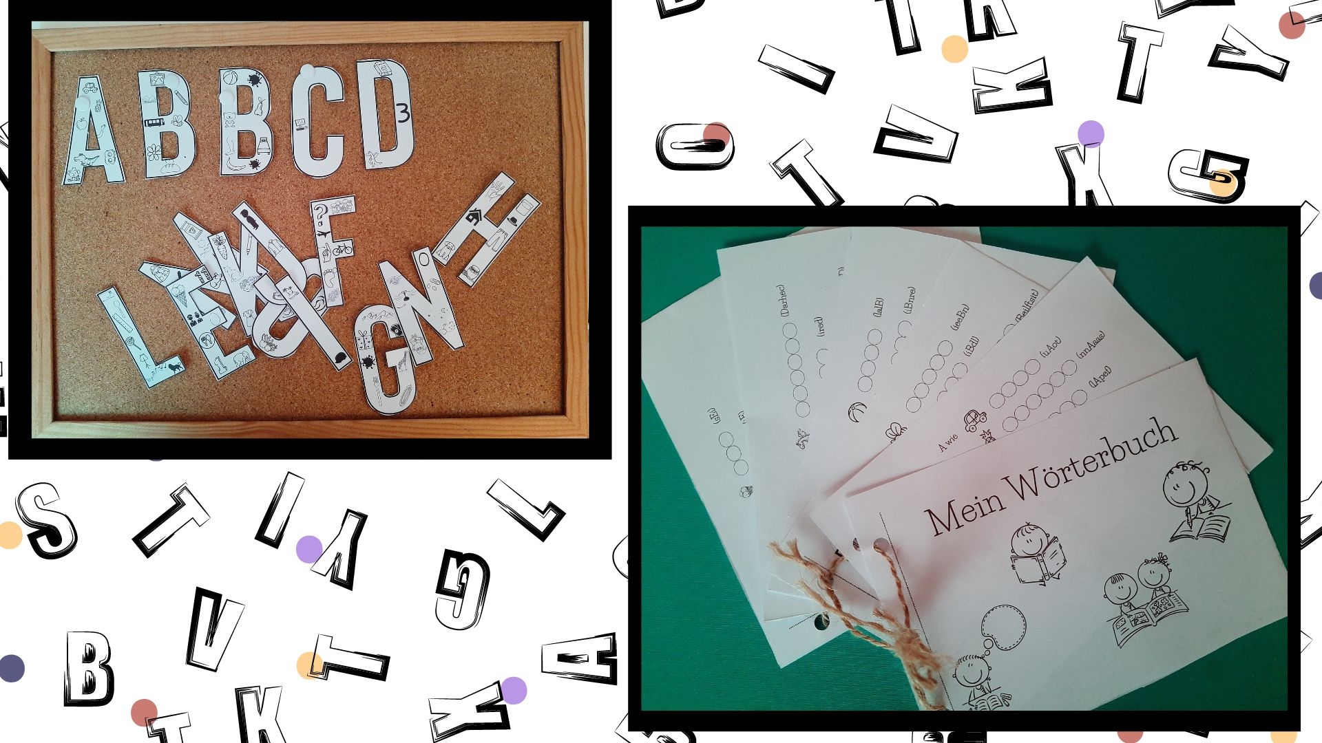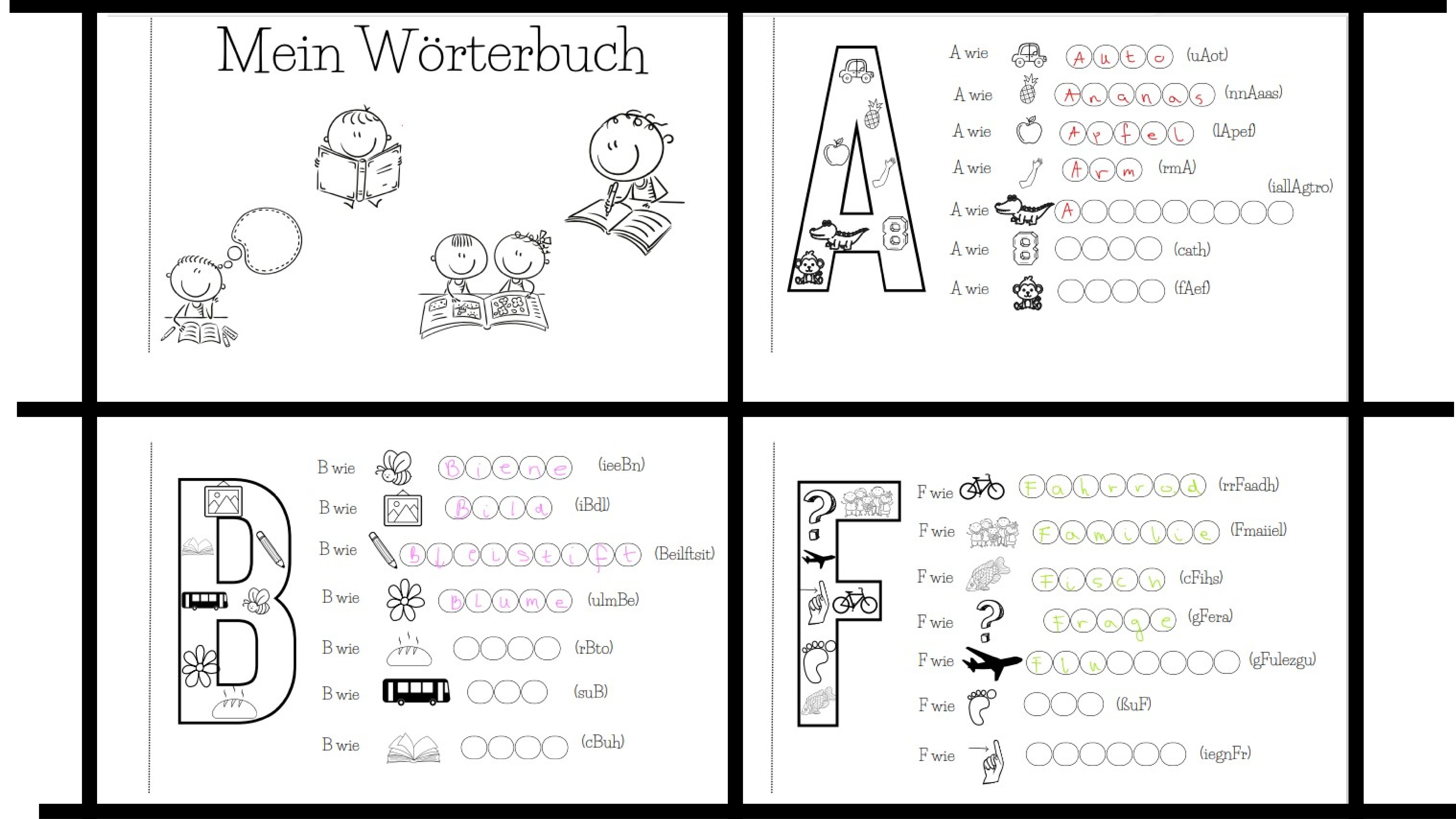 Materiał zawiera ilustrowany słownik najczęściej powtarzających się słów na pierwszym etapie nauki języka niemieckiego w szkole podstawowej (klasy 1-4). Jego atutem jest możliwość udostępniania na tablicy interaktywnej (format pdf), użycia w genially tak, aby można było pisać wspólnie na lekcji. Dla każdego ucznia polecam wydrukować całą książeczkę (w ustawieniach drukowania wybieramy 4 strony na arkuszu) lub pojedynczo (wklejka do zeszytu).  Uczniowie mogą pokolorować obrazki. Jest to materiał do powtórki słownictwa również w domu. Dodatkowym bonusem jest możliwość wykonania gazetki z alfabetem, gdzie wykorzystane będą tylko litery z obrazkami - po zapoznaniu się z całym słownictwem może to być fajna forma sprawdzenia zdobytej wiedzy.