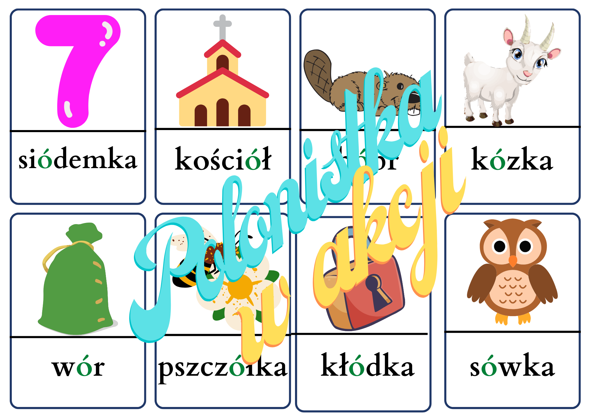 Zestaw zawiera 5 stron, 1 to rewersy, 4 strony zawierają rysunek i wyraz – na każdej po 8 kart (w sumie 32). Należy wydrukować podwójną ilość stron od 1 do 4.