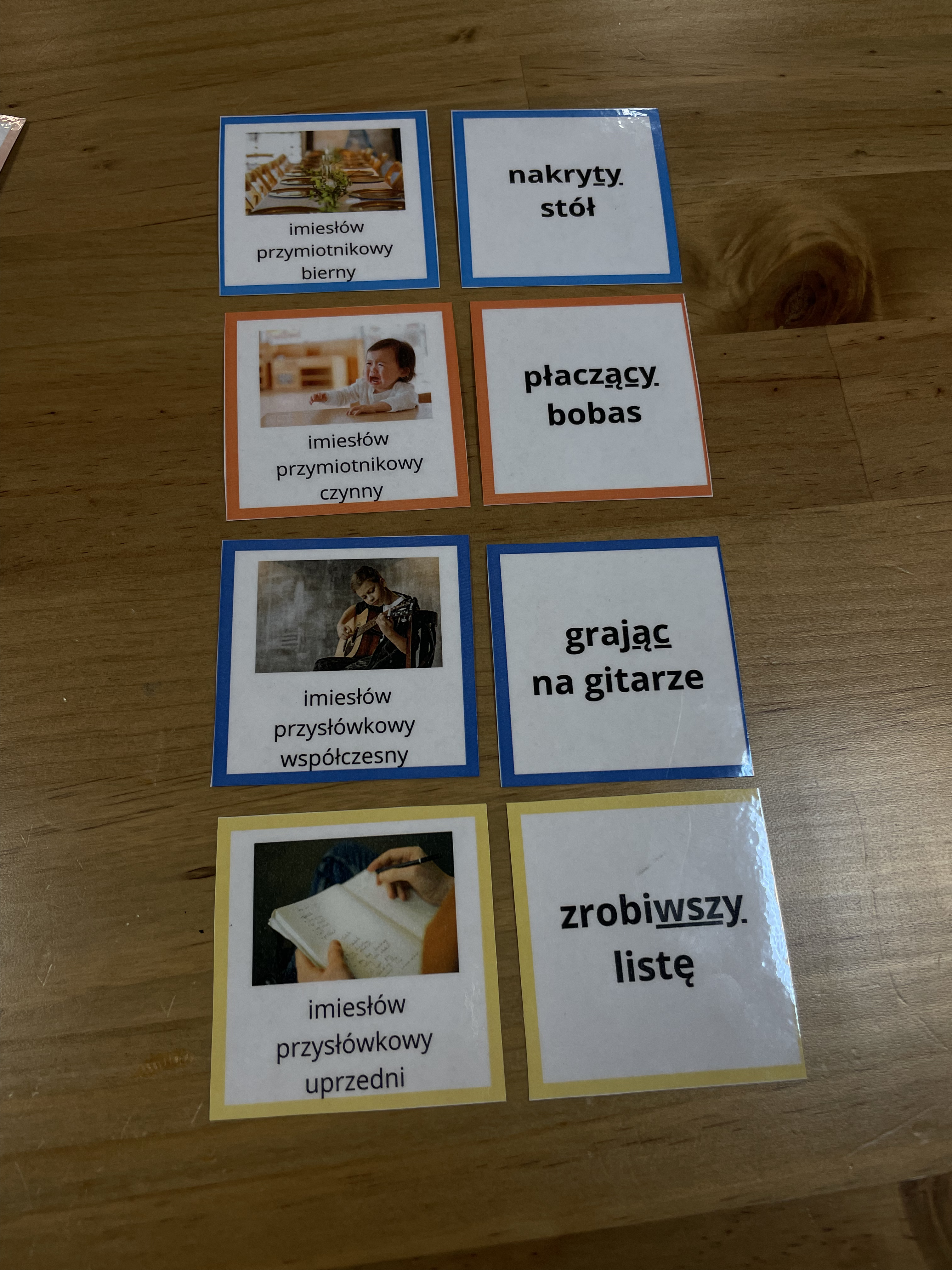 W zestawie znajduje się 24 pary kart – po 6 par dla każdego rodzaju imiesłowu.