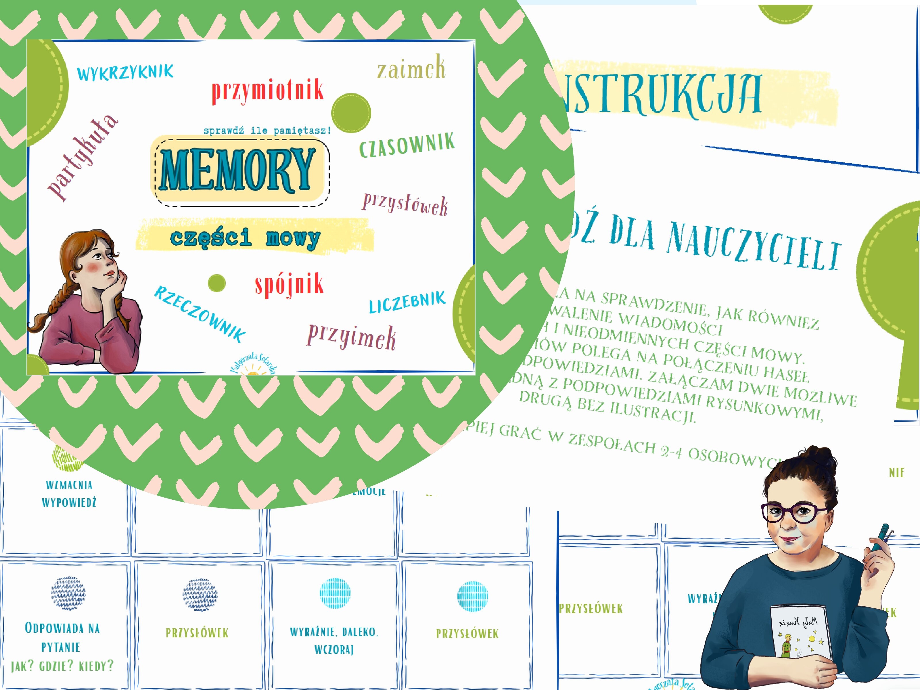 Memory pozwala na sprawdzenie, jak również utrwalenie wiadomości z odmiennych i nieodmiennych części mowy. Zadanie uczniów polega na połączeniu haseł z odpowiednimi odpowiedziami. Załączam dwie możliwe wersje gry. Jedną z podpowiedziami rysunkowymi, drugą bez ilustracji.