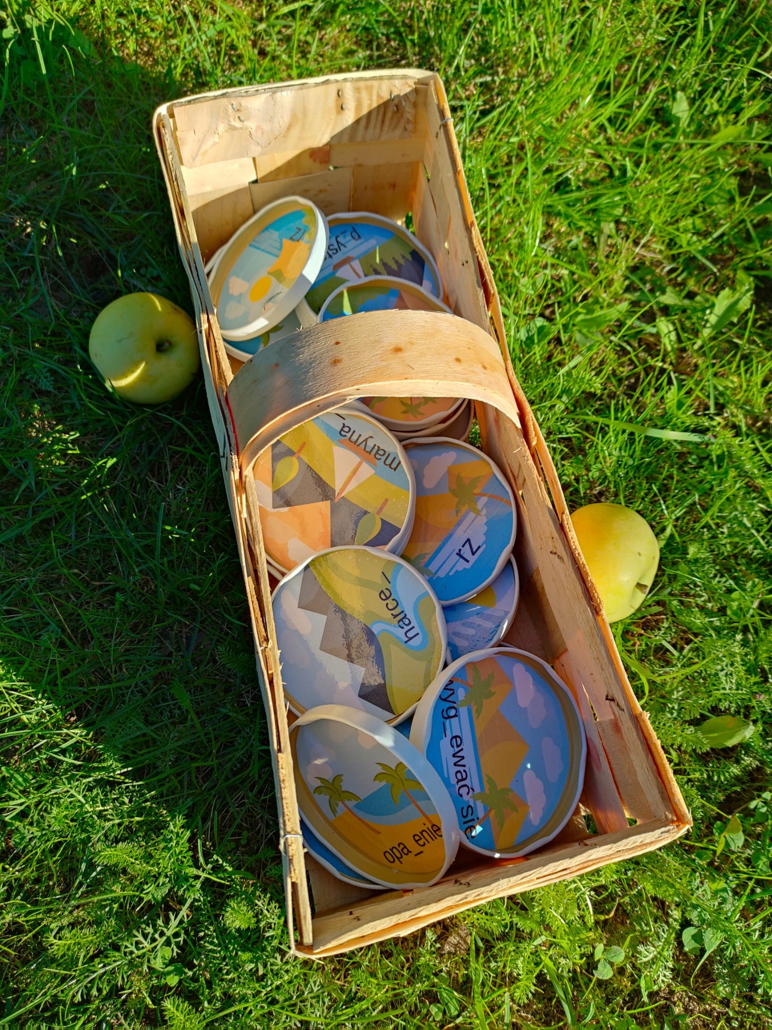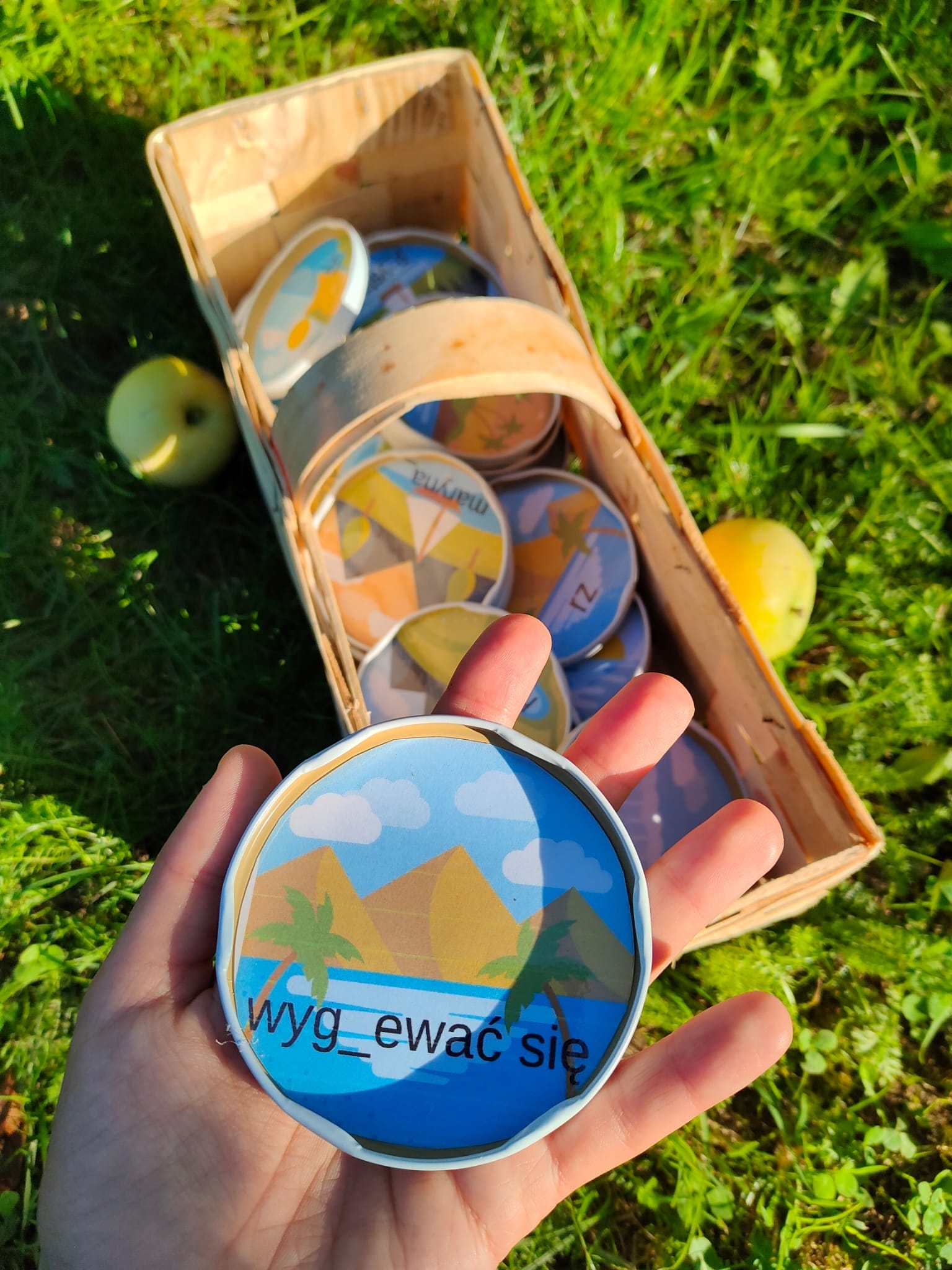 Ja swoje nakleiłam na nakrętki od słoików. Można także wydrukować na grubszym papierze czy też zalaminować.