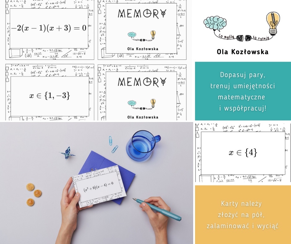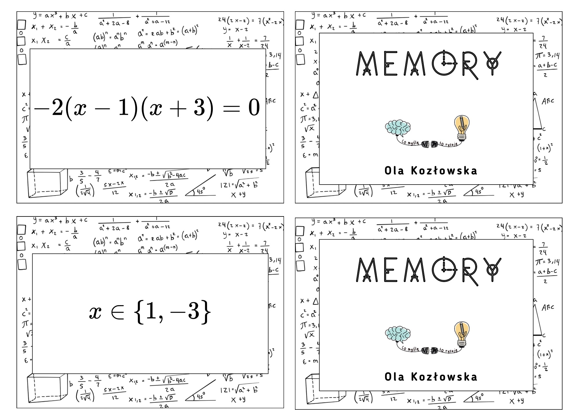 Gra MEMORY z równań wielomianowych - ćwiczenia w wyznaczaniu rozwiązań z postaci iloczynowej.