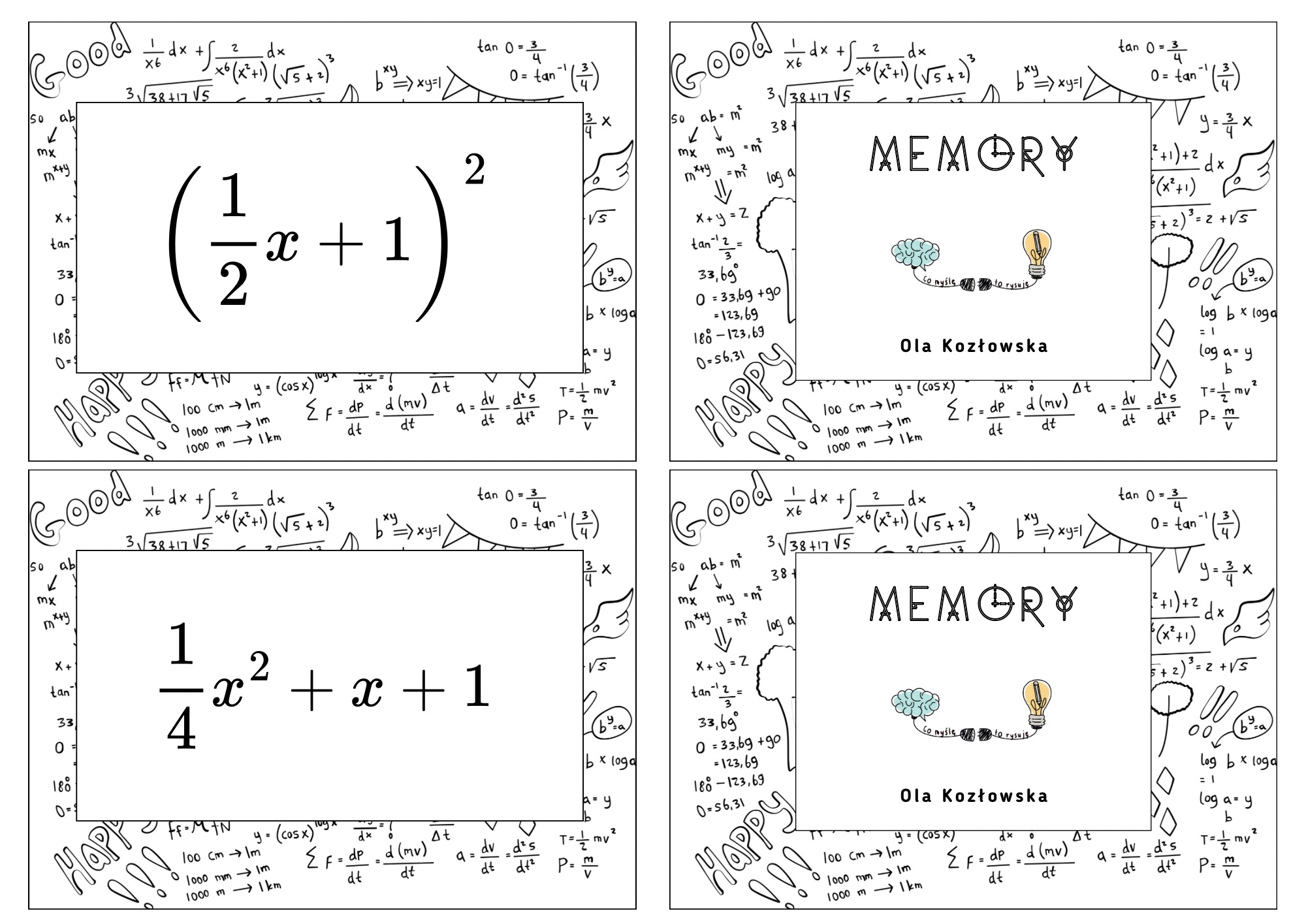 Gra MEMORY ze wzorów skróconego mnożenia - ćwiczenia w wykonywaniu podstawowych przekształceń, także z ułamkami i pierwiastkami, do szkoły średniej.