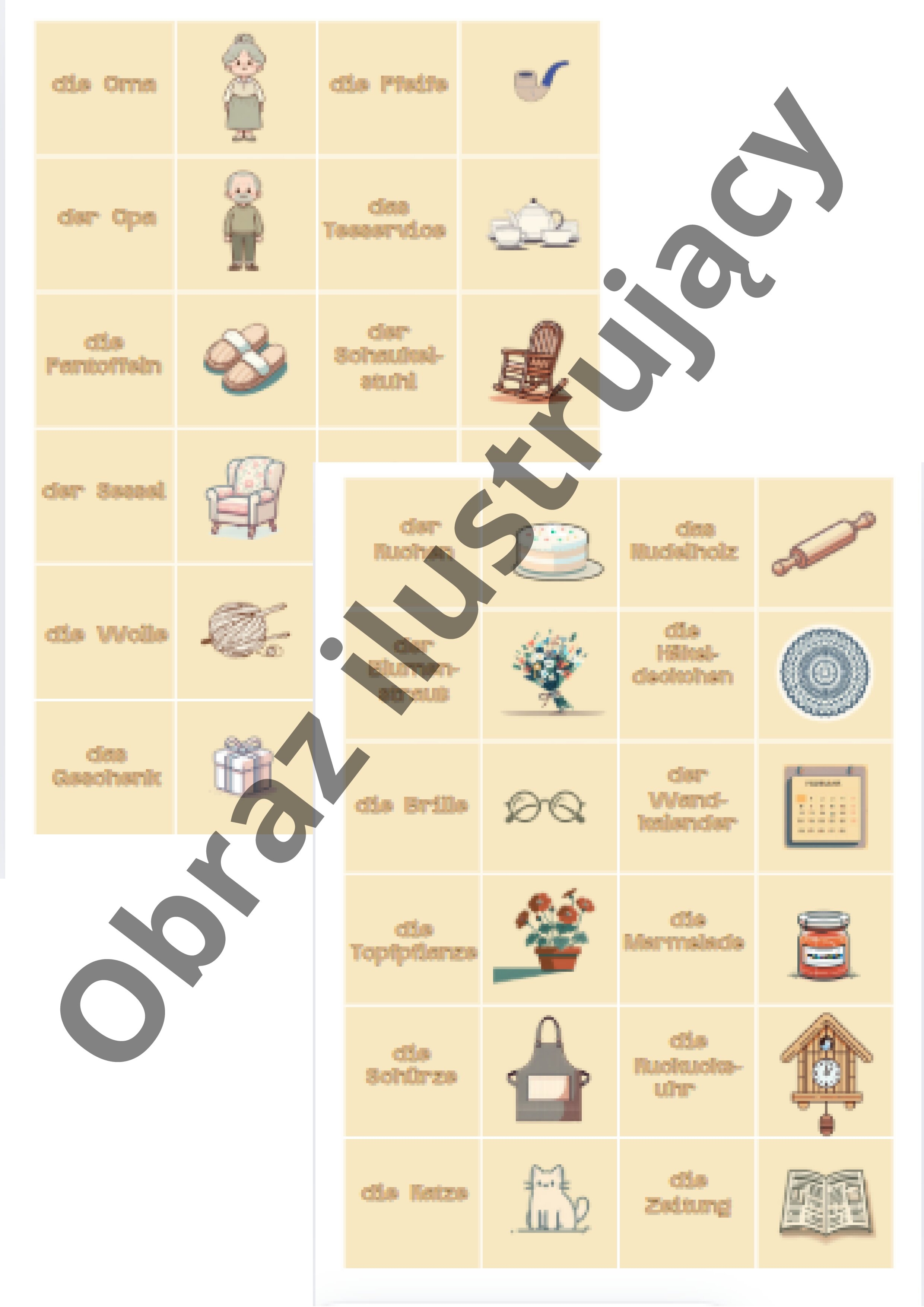 Eleganckie ilustracje i starannie dobrane pojęcia, takie jak die Häkeldeckchen, der Schaukelstuhl, czy das Teeservice, sprawiają, że nauka staje się przyjemnością. Gra doskonale angażuje uczniów, rozwija pamięć oraz wspiera zapamiętywanie nowego słownictwa na poziomie A1-A2.