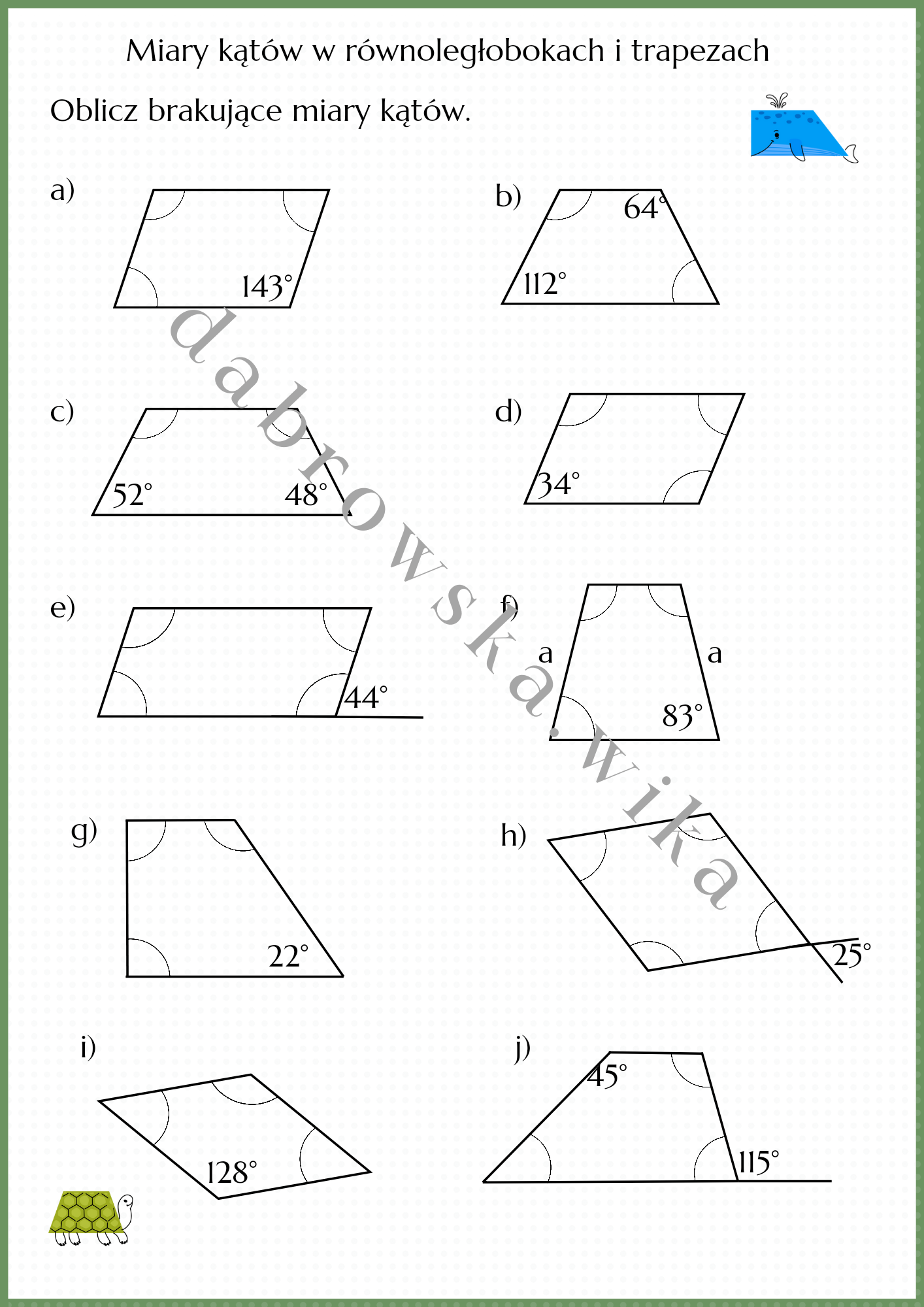 Materiał zawiera kartę pracy z obliczania miar kątów w równoległobokach i trapezach.