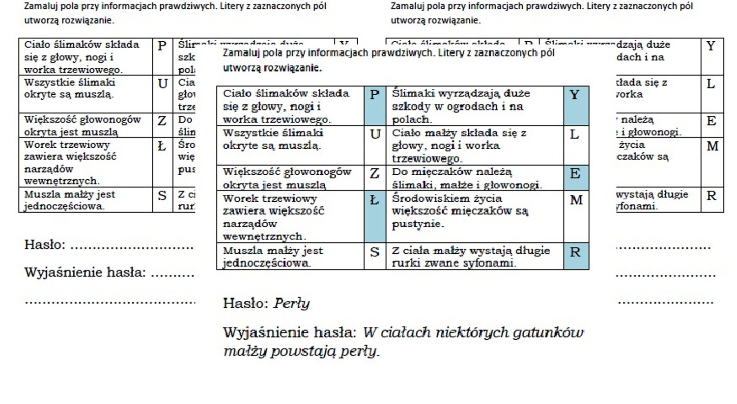 Mięczaki- prawda czy fałsz. Łamigłówka dla klasy VI
