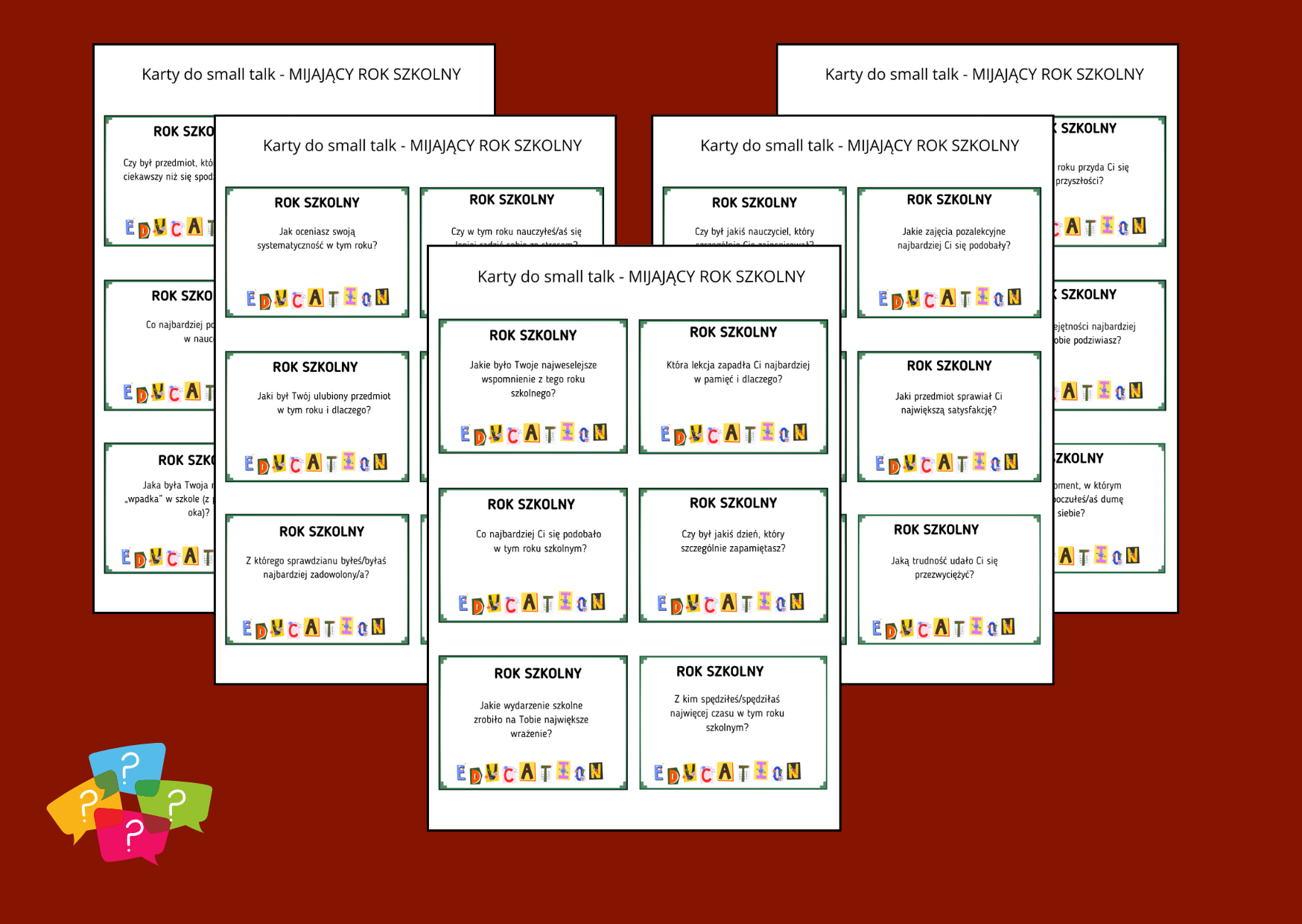 54 pytania typu „Karty small talk” (9 stron A4 po 6 fiszek), dotyczących mijającego roku szkolnego – pytania są uniwersalne i mogą być używane podczas zajęć integracyjnych, lekcji wychowawczych, spotkań bibliotecznych lub jako inspiracja do rozmów. Zasady: uczeń losuje kartę i odpowiada na pytanie (lub wszyscy uczniowie odpowiadają na to samo pytanie).