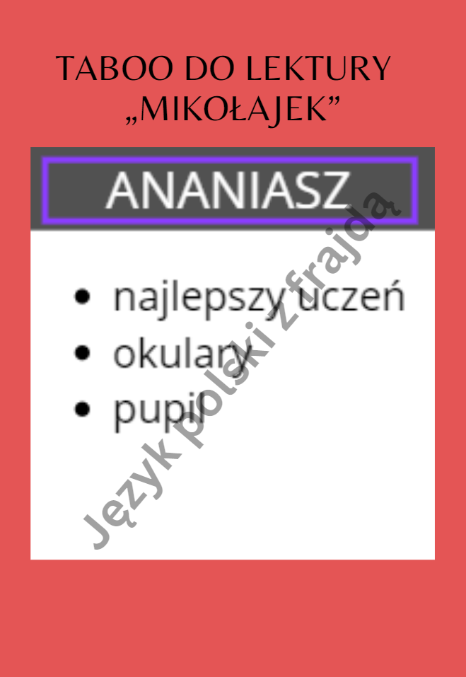 Gra typu taboo oparta o treść lektury Mikołajek. Plik zawiera 12 kart z różnymi postaciami z gry.