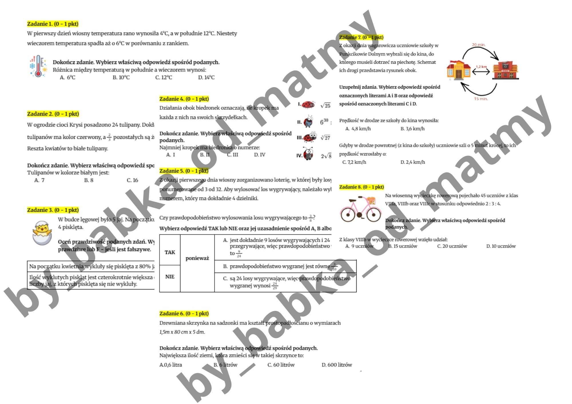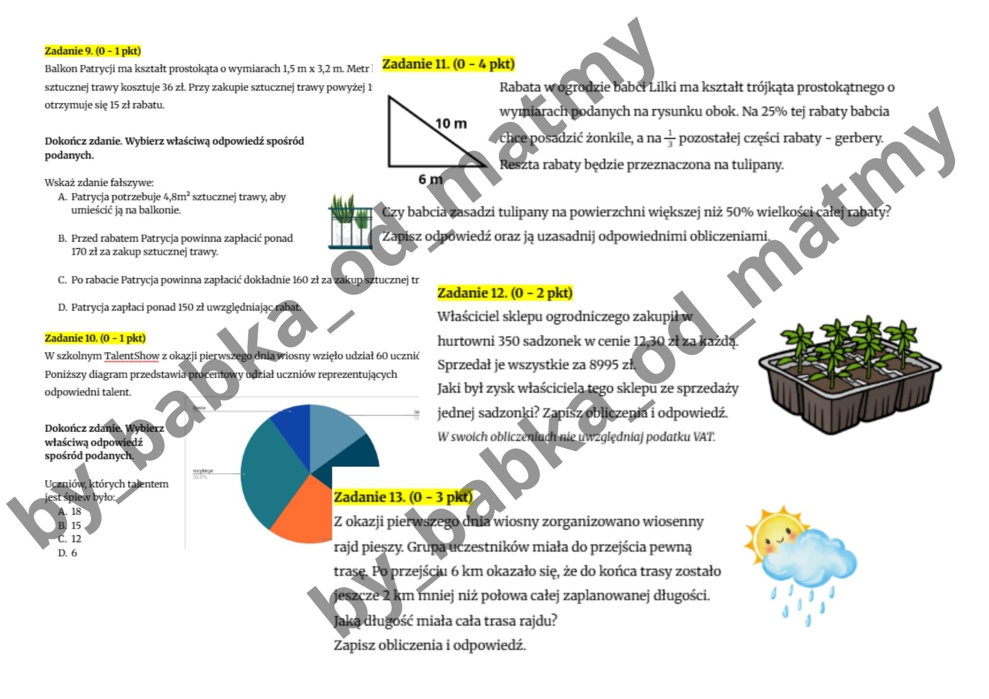 różnorodne zagadnienia: procenty, ułamki, prędkość, skala, geometria, równania, analiza danych.