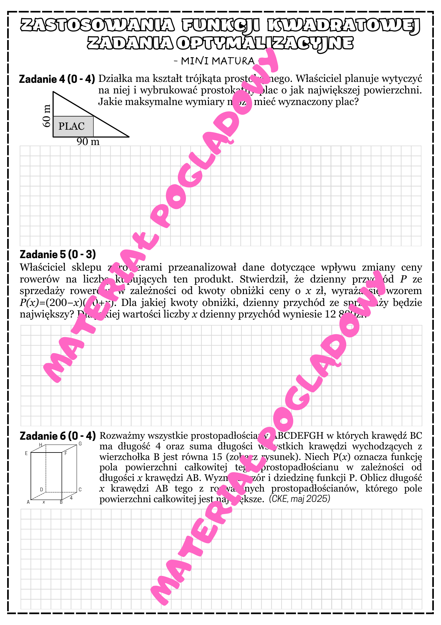 Materiał zawiera 6 zadań związanych z funkcją kwadratową, a tym zadania optymalizacyjne.