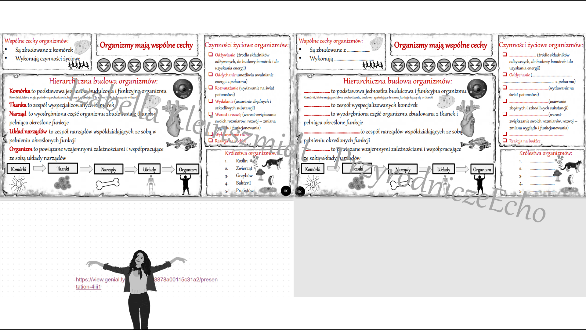 Zapraszam do zakupu mini zestawu „Organizmy mają wspólne cechy” , a w nim wszystko, czego potrzeba do przeprowadzenia zajęć lekcyjnych – sketchnotka i karta pracy oraz gratisowy (darmowy) link do prezentacji multimedialnej, która służy do celów niekomercyjnych. Pomoce dydaktyczne komercyjne (sketchnotka i karta pracy) wykonane zostały w power point, ale pobieracie Państwo w pdf. Prezentacja służy do celów niekomercyjnych i wykonana jest w genial.ly. Jeśli chcecie Państwo z niej korzystać należy założyć konto na genial.ly i po kliknięciu w link ponownie kliknąć w „Reuse this genial.ly” – prezentacja będzie już na Państwa koncie i można ją używać do celów niekomercyjnych. W prezentacji umieszczone są też czasami linki do filmów edukacyjnych. Zapraszam do zakupu i miłego korzystania. Grafika komercyjnych  pomocy (jak takowa jest) – samodzielna lub pochodzi z pixabay.com i freepik.com.