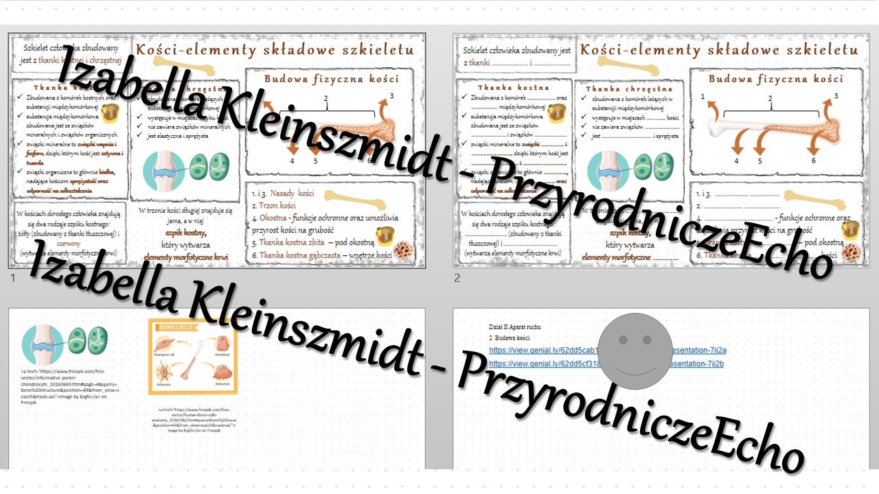 Witajcie Nazywam się Izabella Kleinszmidt (PrzyrodniczeEcho). Jestem nauczycielem przyrody, biologii, geografii i chemii w szkole podstawowej w Pomysku Wielkim. Uwielbiam mój zawód i cieszę się, że robię w życiu to co kocham. Pasja dla nauczyciela jest bardzo ważna:). Prowadzę stronę PrzyrodniczeEcho na FB, nagrywam filmiki do lekcji, konstruuję prezentacje i lekcje multimedialne, escape roomy oraz sketchnotki i karty pracy w programie power point. Zapraszam na stronę internetową mojej szkoły, gdzie znajdują się (niektóre darmowe) opracowania lekcji do przyrody, biologii, geografii i chemii w SP. Adres strony internetowej: https://sppomyskwielki.edu.pl - zakładka - dla ucznia. Od niedawna zapraszam również na moją stronę internetową: https://ikleinszmidt.wixsite.com/przyrodniczeecho Zapraszam do korzystania z mojej pracy:) Bardzo proszę również czytać opisy, aby wiedzieć, jaki materiał znajduje się w danym pliku. Zachęcam do kontaktu w razie jakichś pytań lub błędów w pomocach - brakach lub literówkach-wszystko można naprawić? Jakich materiałów możecie Państwo oczekiwać? SKETCHNOTKA - notatka kompletna z określonego tematu KARTA PRACY - zazwyczaj sketchnotka z wykropkowanymi miejscami PREZENTACJA MULTIMEDIALNA - kompletne wiadomości do odpowiedniego tematu wraz z grafiką i tekstem - zarówno w power point jak i genially - tę koniecznie należy zapisać na swoim koncie! LEKCJA MULTIMEDIALNA - pomysł na przeprowadzenie lekcji - taki "tok lekcji" - skrócony scenariusz ZESTAWY - proszę się wczytać w opis, informuję co mieści się w konkretnym zestawie:) Pozdrawiam cieplutko:)
