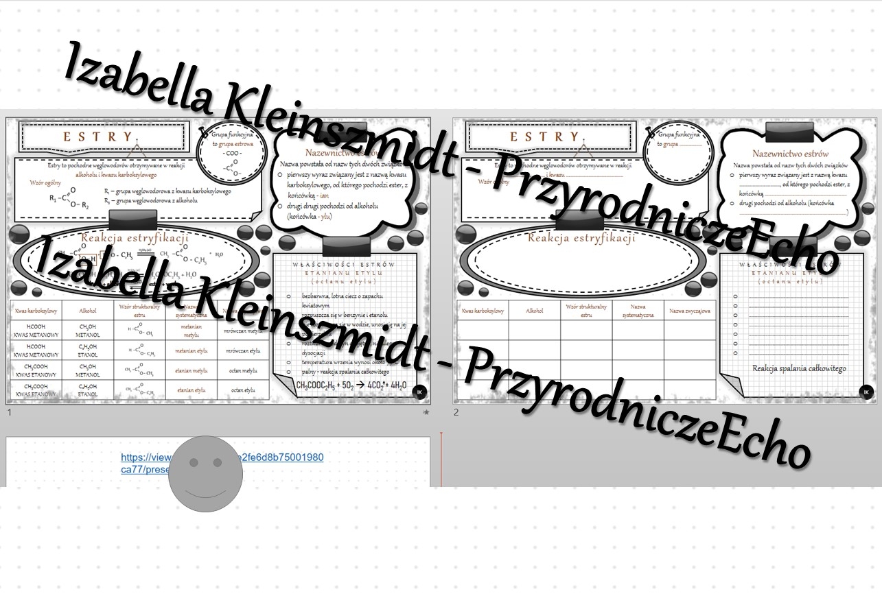 Witajcie Nazywam się Izabella Kleinszmidt (PrzyrodniczeEcho). Jestem nauczycielem przyrody, biologii, geografii i chemii w szkole podstawowej w Pomysku Wielkim. Uwielbiam mój zawód i cieszę się, że robię w życiu to co kocham. Pasja dla nauczyciela jest bardzo ważna:). Prowadzę stronę PrzyrodniczeEcho na FB, nagrywam filmiki do lekcji, konstruuję prezentacje i lekcje multimedialne, escape roomy oraz sketchnotki i karty pracy w programie power point. Zapraszam na stronę internetową mojej szkoły, gdzie znajdują się (niektóre darmowe) opracowania lekcji do przyrody, biologii, geografii i chemii w SP. Adres strony internetowej: https://sppomyskwielki.edu.pl - zakładka - dla ucznia. Od niedawna zapraszam również na moją stronę internetową: https://ikleinszmidt.wixsite.com/przyrodniczeecho Zapraszam do korzystania z mojej pracy:) Bardzo proszę również czytać opisy, aby wiedzieć, jaki materiał znajduje się w danym pliku. Zachęcam do kontaktu w razie jakichś pytań lub błędów w pomocach - brakach lub literówkach-wszystko można naprawić? Jakich materiałów możecie Państwo oczekiwać? SKETCHNOTKA - notatka kompletna z określonego tematu KARTA PRACY - zazwyczaj sketchnotka z wykropkowanymi miejscami PREZENTACJA MULTIMEDIALNA - kompletne wiadomości do odpowiedniego tematu wraz z grafiką i tekstem - zarówno w power point jak i genially - tę koniecznie należy zapisać na swoim koncie! LEKCJA MULTIMEDIALNA - pomysł na przeprowadzenie lekcji - taki "tok lekcji" - skrócony scenariusz ZESTAWY - proszę się wczytać w opis, informuję co mieści się w konkretnym zestawie:) Pozdrawiam cieplutko:)