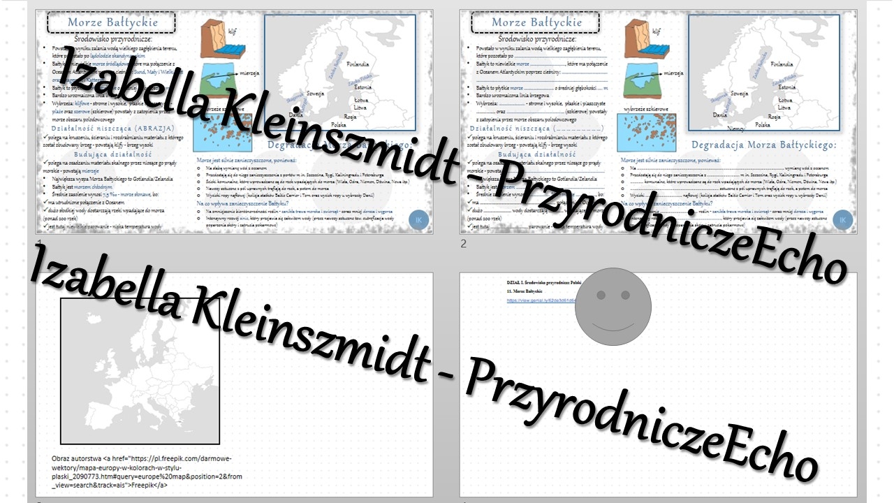 Witajcie Nazywam się Izabella Kleinszmidt (PrzyrodniczeEcho). Jestem nauczycielem przyrody, biologii, geografii i chemii w szkole podstawowej w Pomysku Wielkim. Uwielbiam mój zawód i cieszę się, że robię w życiu to co kocham. Pasja dla nauczyciela jest bardzo ważna:). Prowadzę stronę PrzyrodniczeEcho na FB, nagrywam filmiki do lekcji, konstruuję prezentacje i lekcje multimedialne, escape roomy oraz sketchnotki i karty pracy w programie power point. Zapraszam na stronę internetową mojej szkoły, gdzie znajdują się (niektóre darmowe) opracowania lekcji do przyrody, biologii, geografii i chemii w SP. Adres strony internetowej: https://sppomyskwielki.edu.pl - zakładka - dla ucznia. Od niedawna zapraszam również na moją stronę internetową: https://ikleinszmidt.wixsite.com/przyrodniczeecho Zapraszam do korzystania z mojej pracy:) Bardzo proszę również czytać opisy, aby wiedzieć, jaki materiał znajduje się w danym pliku. Zachęcam do kontaktu w razie jakichś pytań lub błędów w pomocach - brakach lub literówkach-wszystko można naprawić? Jakich materiałów możecie Państwo oczekiwać? SKETCHNOTKA - notatka kompletna z określonego tematu KARTA PRACY - zazwyczaj sketchnotka z wykropkowanymi miejscami PREZENTACJA MULTIMEDIALNA - kompletne wiadomości do odpowiedniego tematu wraz z grafiką i tekstem - zarówno w power point jak i genially - tę koniecznie należy zapisać na swoim koncie! LEKCJA MULTIMEDIALNA - pomysł na przeprowadzenie lekcji - taki "tok lekcji" - skrócony scenariusz ZESTAWY - proszę się wczytać w opis, informuję co mieści się w konkretnym zestawie:) Pozdrawiam cieplutko:)