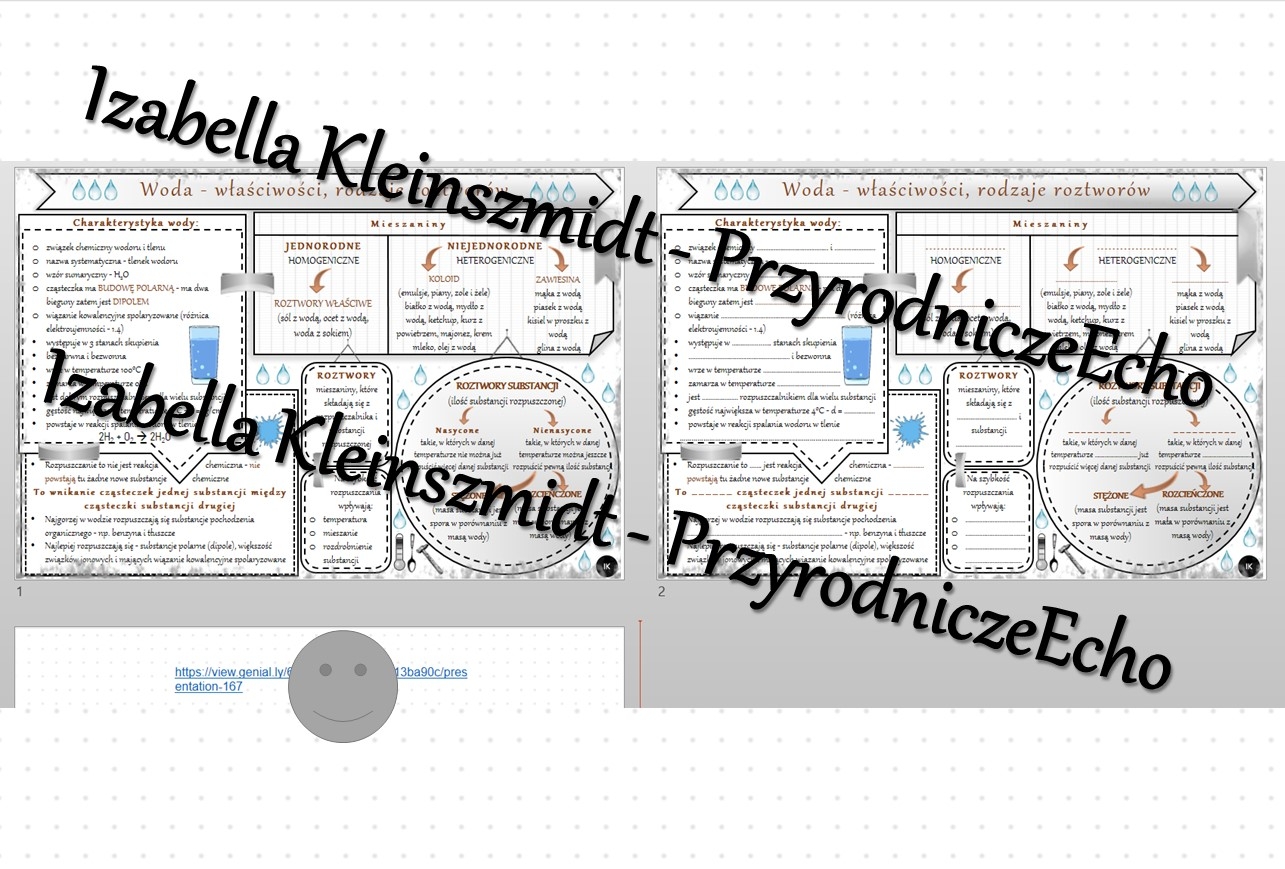 Minizestaw na temat „Woda – właściwości, rodzaje roztworów” – sketchnotka + karta pracy w power point + gratisowy link do prezentacji multimedialnej niekomercyjnej wykonanej w genial.ly do indywidualnego pobrania i użycia do celów niekomercyjnych. Chemia