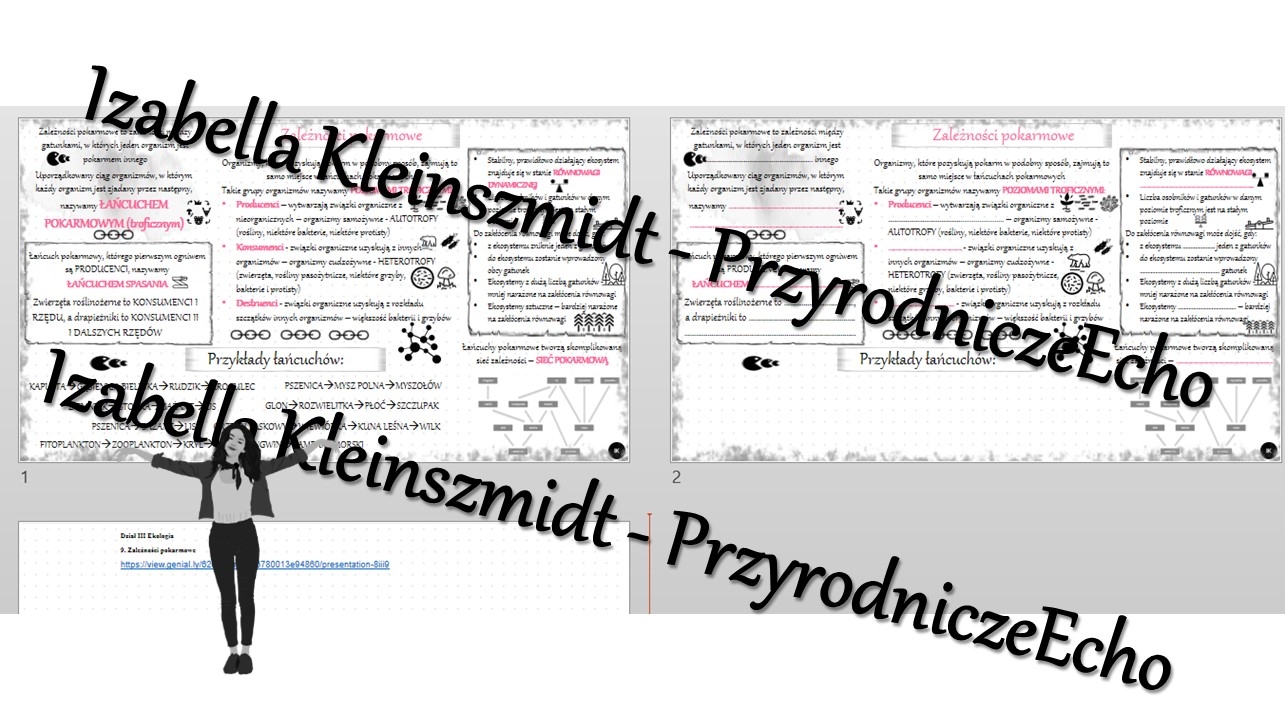 Witajcie Nazywam się Izabella Kleinszmidt (PrzyrodniczeEcho). Jestem nauczycielem przyrody, biologii, geografii i chemii w szkole podstawowej w Pomysku Wielkim. Uwielbiam mój zawód i cieszę się, że robię w życiu to co kocham. Pasja dla nauczyciela jest bardzo ważna:). Prowadzę stronę PrzyrodniczeEcho na FB, nagrywam filmiki do lekcji, konstruuję prezentacje i lekcje multimedialne, escape roomy oraz sketchnotki i karty pracy w programie power point. Zapraszam na stronę internetową mojej szkoły, gdzie znajdują się (niektóre darmowe) opracowania lekcji do przyrody, biologii, geografii i chemii w SP. Adres strony internetowej: https://sppomyskwielki.edu.pl - zakładka - dla ucznia. Od niedawna zapraszam również na moją stronę internetową: https://ikleinszmidt.wixsite.com/przyrodniczeecho Zapraszam do korzystania z mojej pracy:) Bardzo proszę również czytać opisy, aby wiedzieć, jaki materiał znajduje się w danym pliku. Zachęcam do kontaktu w razie jakichś pytań lub błędów w pomocach - brakach lub literówkach-wszystko można naprawić? Jakich materiałów możecie Państwo oczekiwać? SKETCHNOTKA - notatka kompletna z określonego tematu KARTA PRACY - zazwyczaj sketchnotka z wykropkowanymi miejscami PREZENTACJA MULTIMEDIALNA - kompletne wiadomości do odpowiedniego tematu wraz z grafiką i tekstem - zarówno w power point jak i genially - tę koniecznie należy zapisać na swoim koncie! LEKCJA MULTIMEDIALNA - pomysł na przeprowadzenie lekcji - taki "tok lekcji" - skrócony scenariusz ZESTAWY - proszę się wczytać w opis, informuję co mieści się w konkretnym zestawie:) Pozdrawiam cieplutko:)
