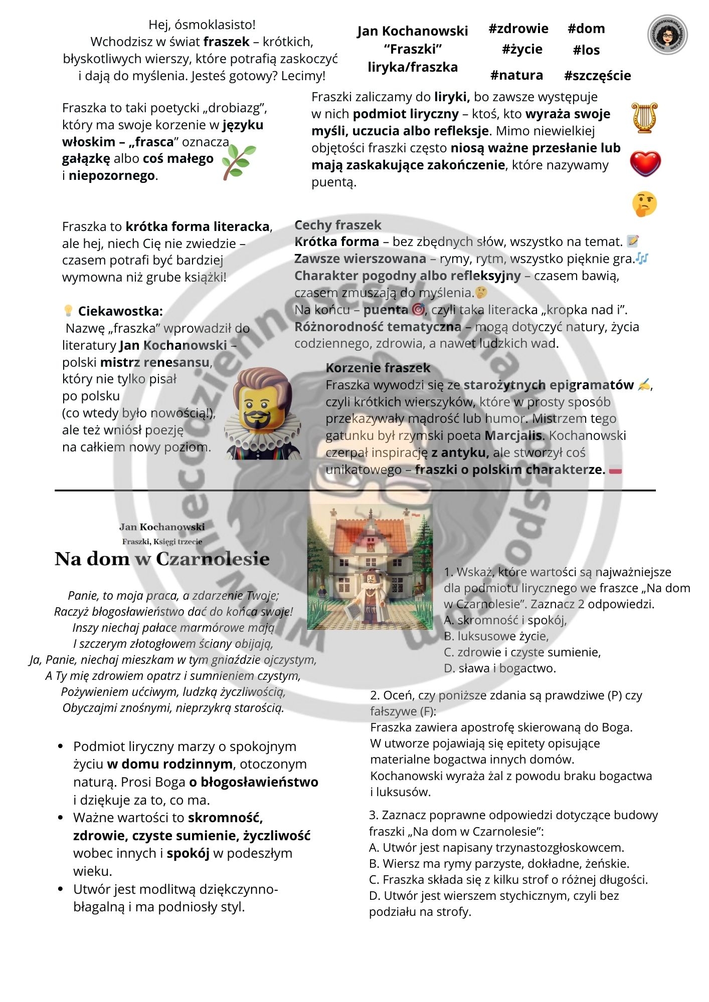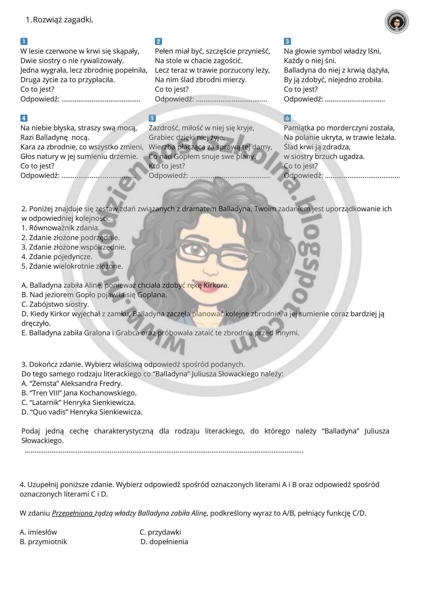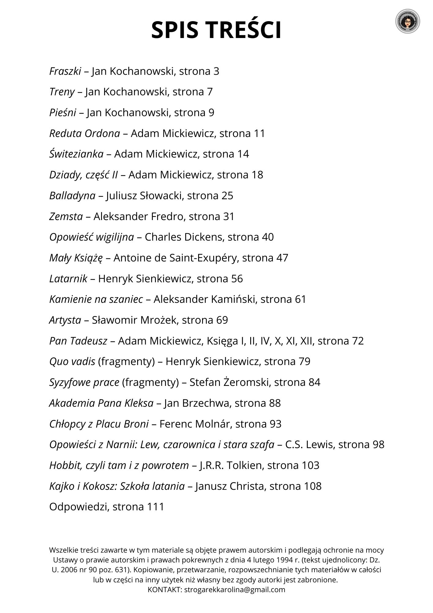✔ Ćwiczenia sprawdzające wiedzę z lektur, teorii literatury, gramatyki, ortografii i interpunkcji.