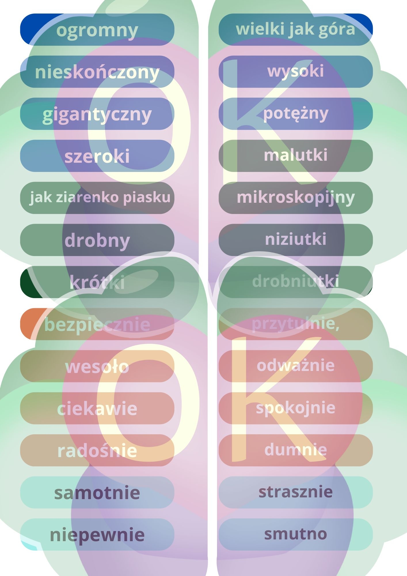 Bank słów: Gotowa lista przymiotników i określeń ułatwiająca dzieciom nazywanie stanów emocjonalnych i opisywanie otoczenia.