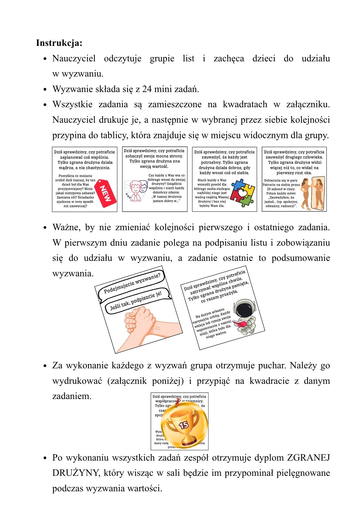 „Misja: ZGRANA DRUŻYNA” to 24-dniowe wyzwanie, które krok po kroku pomaga dzieciom stać się prawdziwym zespołem. Poprzez zabawne, angażujące zadania uczą się one, jak działać razem, rozwiązywać konflikty, wspierać się i dostrzegać w sobie nawzajem mocne strony.
