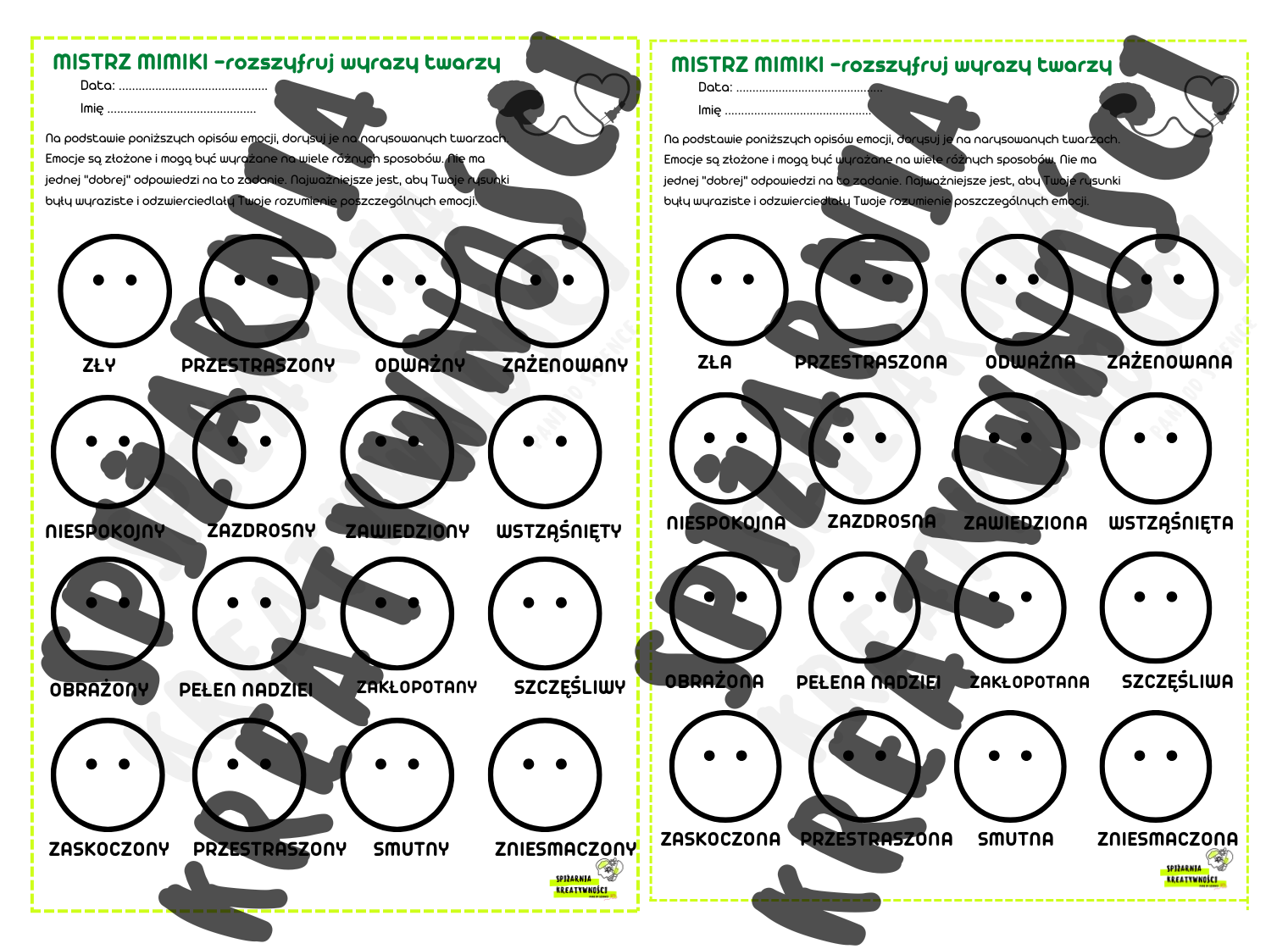 Pakiet zawiera dwie wersje kart, pierwsza wersje z przypisanymi emocjami, natomiast druga wersja to puste pola na własne pomysły.