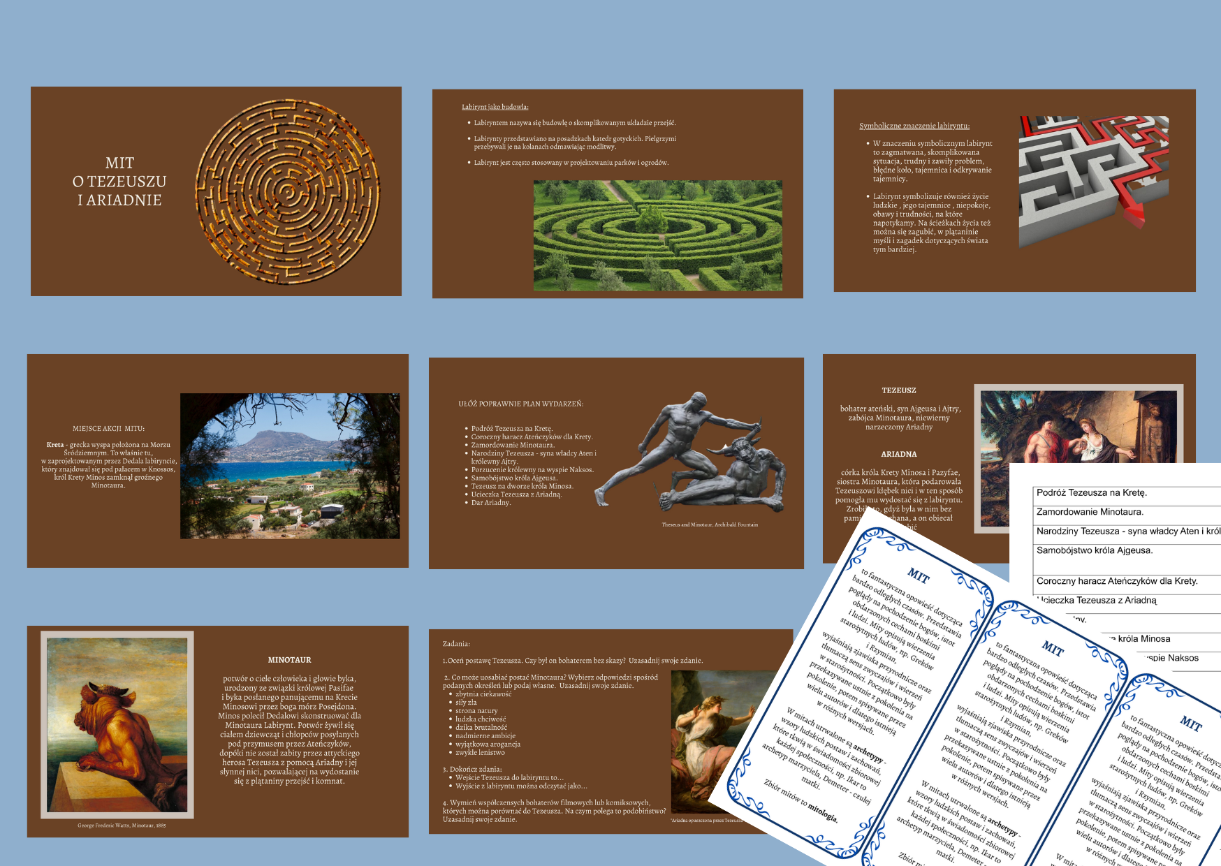 Zestaw na lekcję dotyczącą mitu o Ariadnie i Tezeuszu, w skład którego wchodzą: prezentacja (16 slajdów), a także wklejka – mit i jego cechy oraz plan wydarzeń do wycięcia i ułożenia.