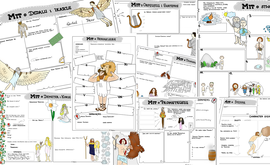 W skład zestawu wchodzi 8 kart (każda w trzech wersjach: pusta czarno-biała, pusta kolorowa i uzupełniona kolorowa, czyli łącznie 24 karty). Karty dotyczą następujących mitów: 1. Mit o Prometeuszu. 2. Mit o Demeter i Korze. 3. Mit o Dedalu i Ikarze. 4. Mit o Orfeuszu i Eurydyce. 5. Mit o Heraklesie. 6. Mit o Syzyfie. 7. Mit o Tezeuszu i Ariadnie. 8. Mit o stworzeniu świata.