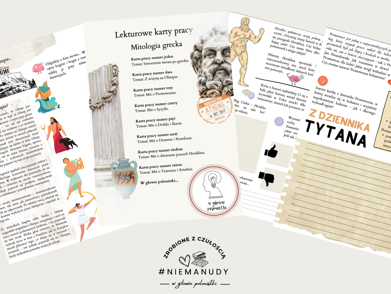 Lekturowe karty pracy - Mitologia grecka dla klasy piątej. Zestaw kart, który pozwoli krok po kroku odkurzyć stare dzieje. Zestaw liczy 44 strony A4 zrobione z ogromną polonistyczną czułością!